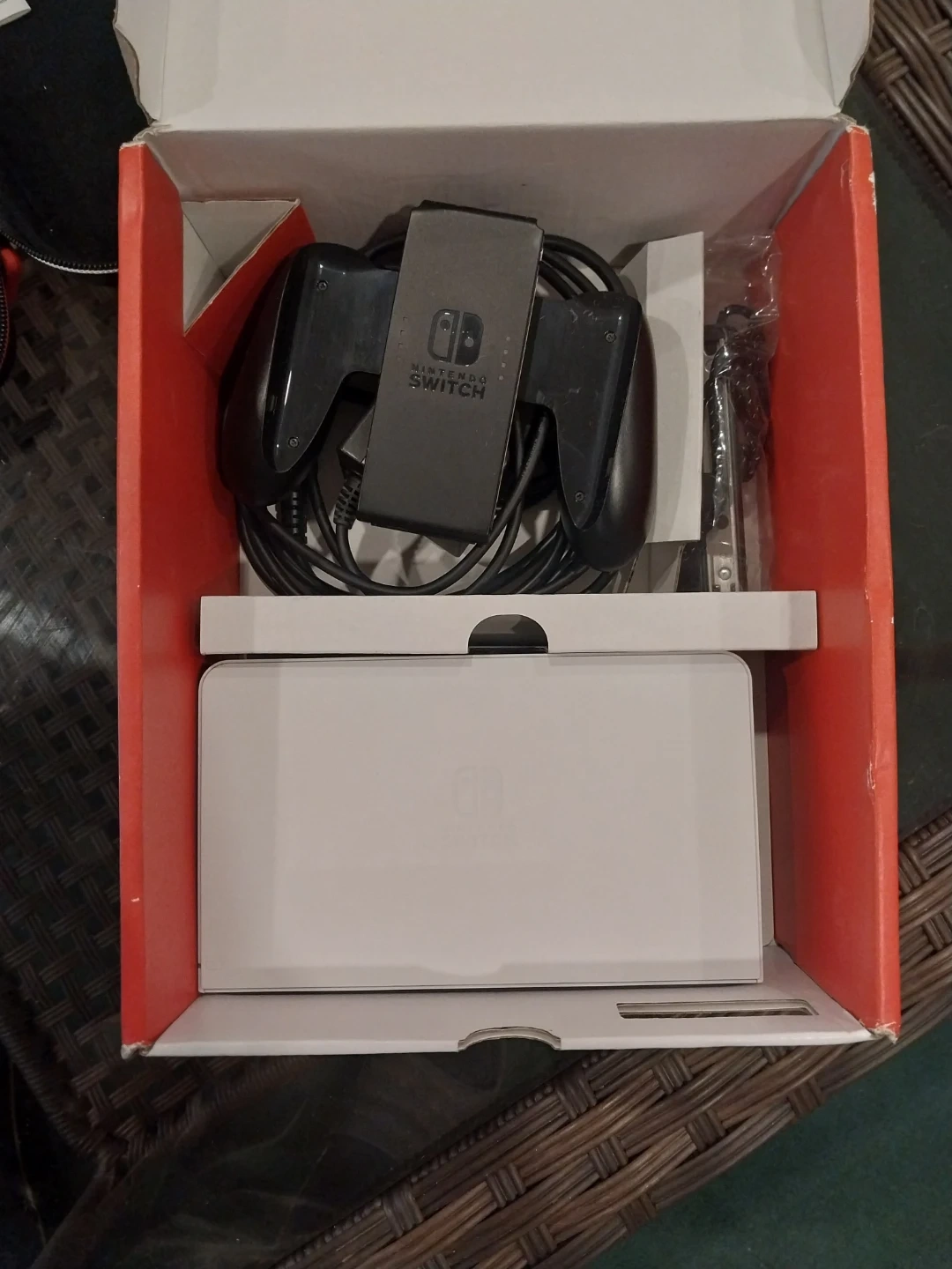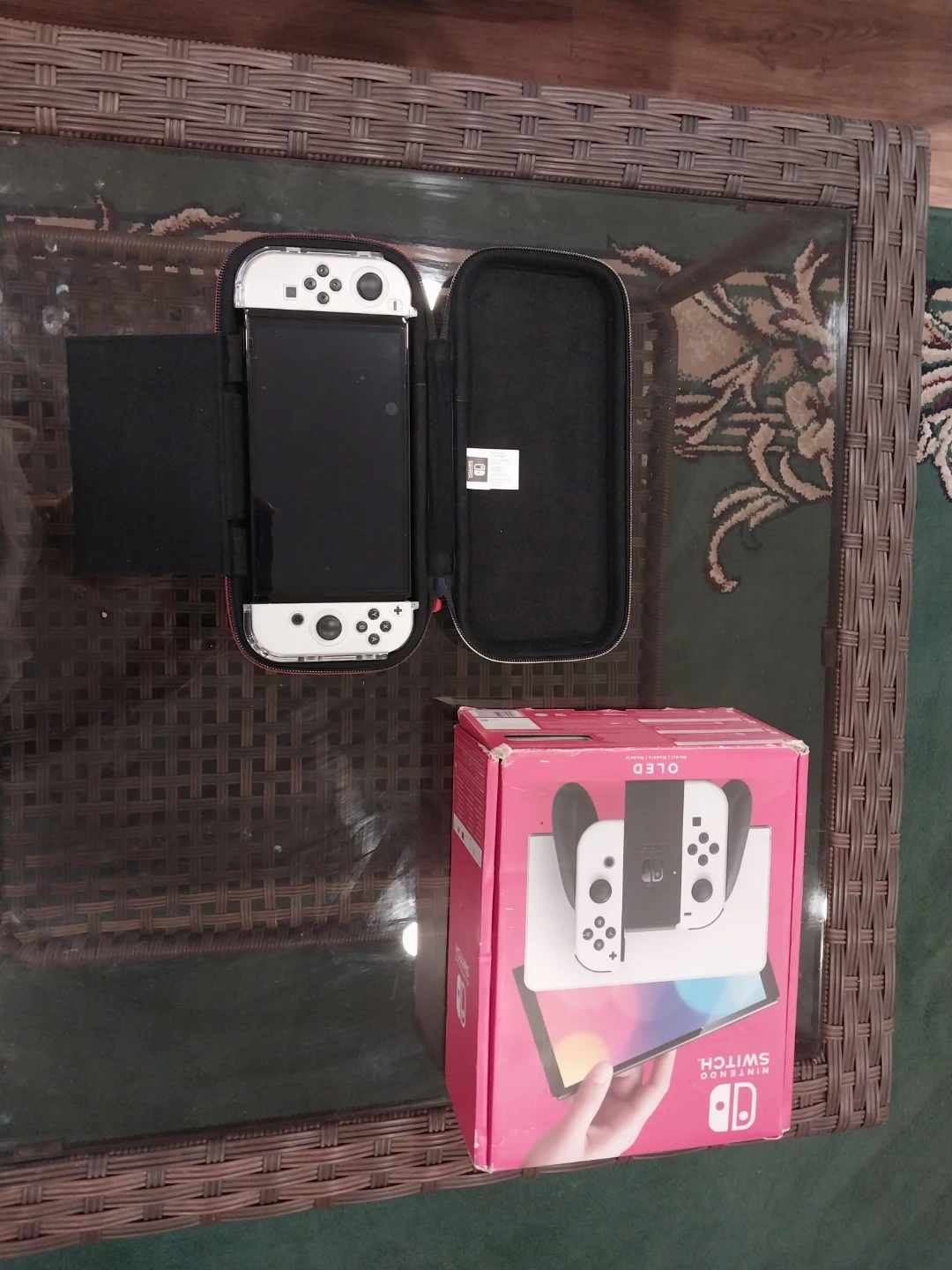 Nintendo Switch OLED model in white. Includes original box and all original accessories like the dock, controllers, and cables. Also comes with a black carrying case for the console. It's perfect for gaming on the go or at home!