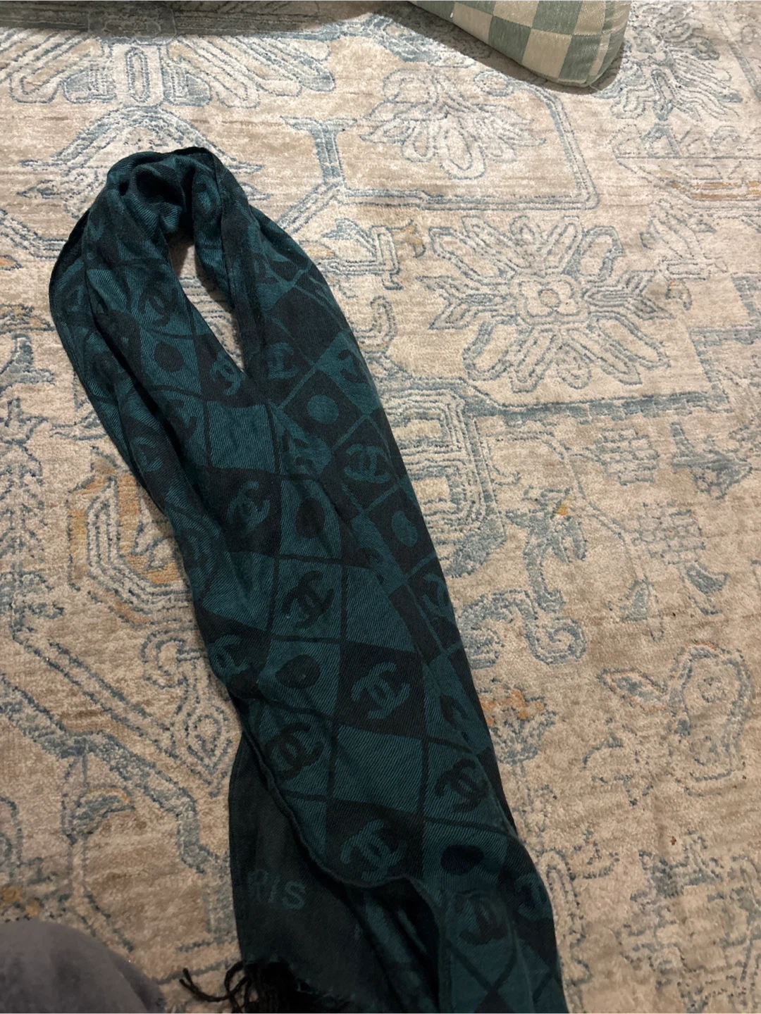 Selling a stylish Chanel scarf in a lovely green and black colour combination. It has the iconic Chanel logo pattern. It's in great condition and ready to add a touch of luxury to your wardrobe!