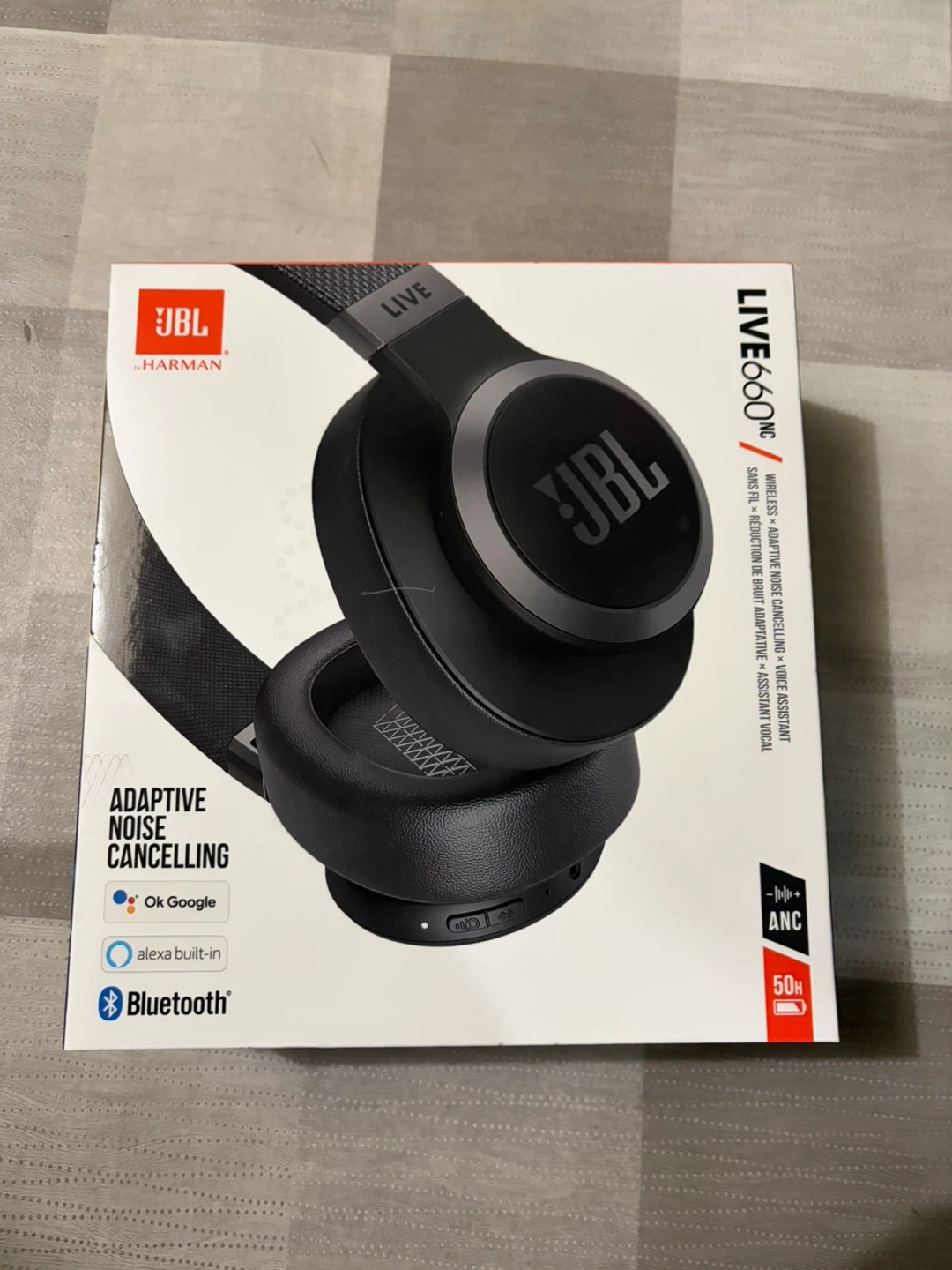 JBL LIVE660NC wireless headphones with adaptive noise cancelling. They feature Bluetooth connectivity and are built with Ok Google and Alexa voice assistant support. Enjoy up to 50 hours of playback time! Only used once comes with box and everything it originally came with paid $350 at bestbuy.