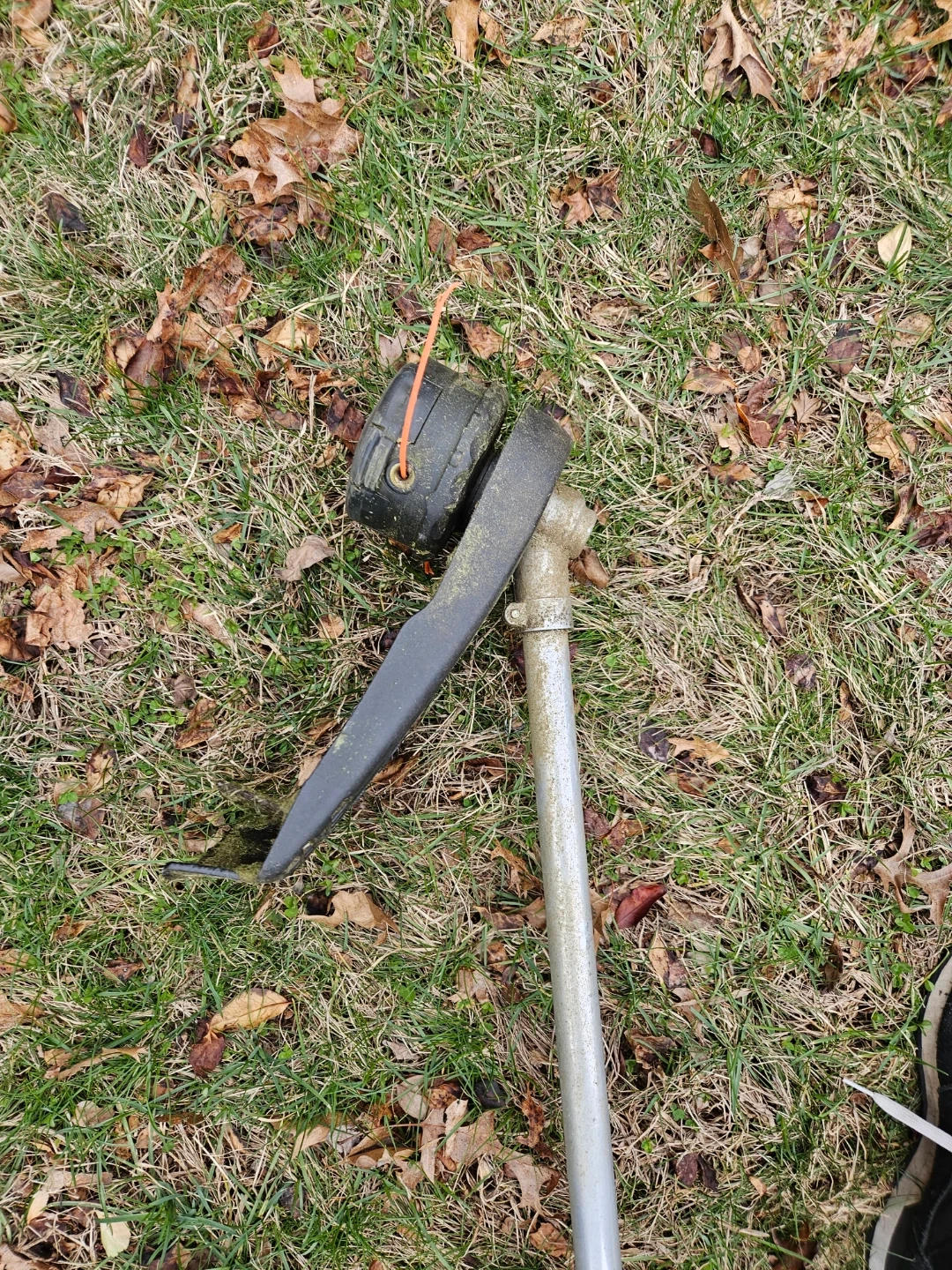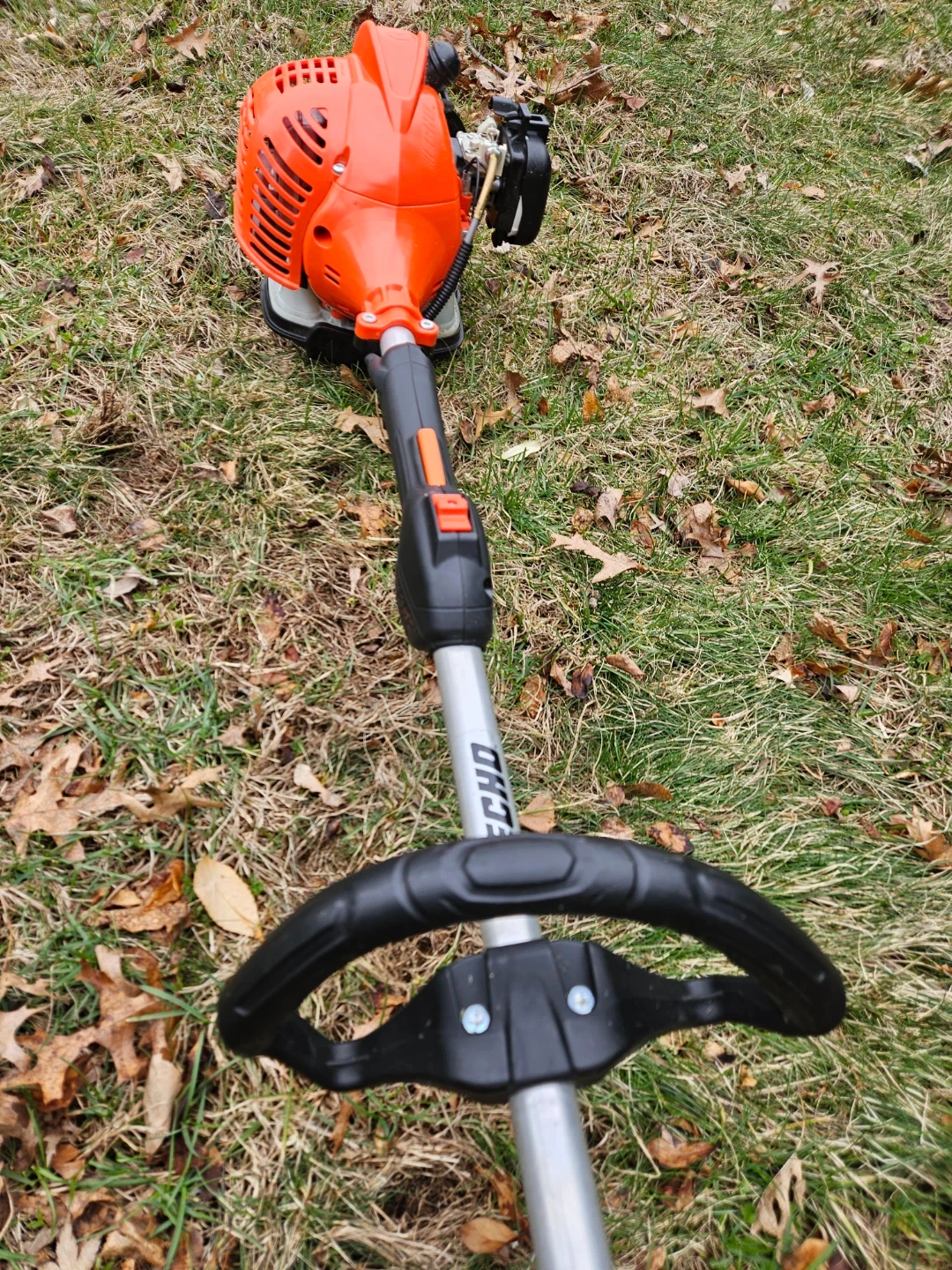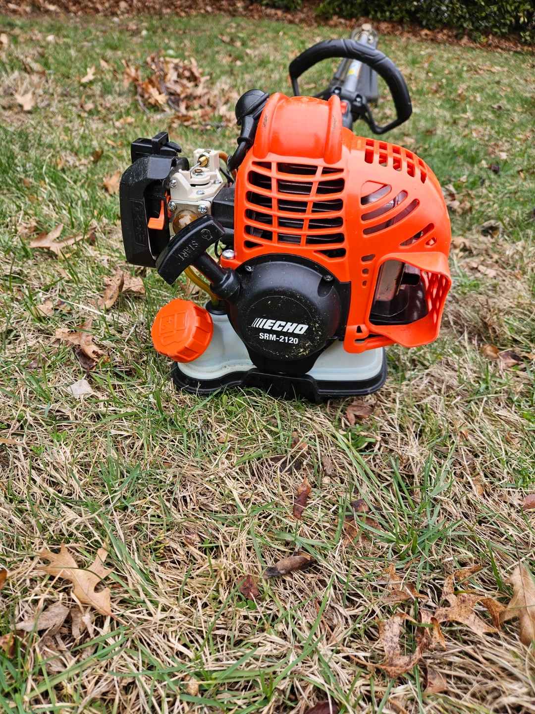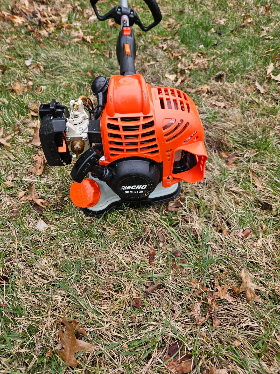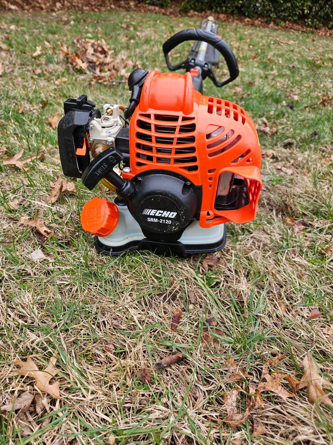 Echo SRM-2120 gas-powered string trimmer. Orange and black color. This trimmer's engine is located at the top of the shaft. It features a curved shaft design. This is a reliable tool for lawn maintenance!