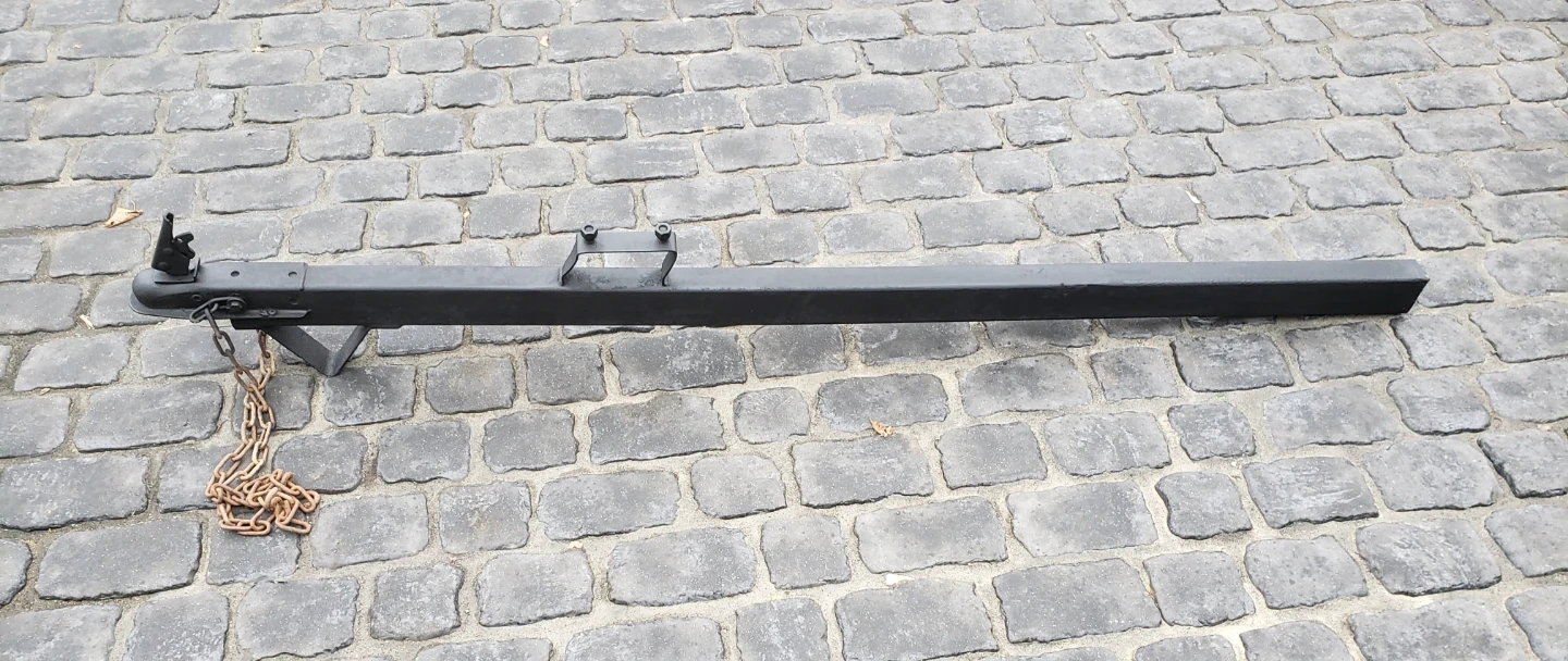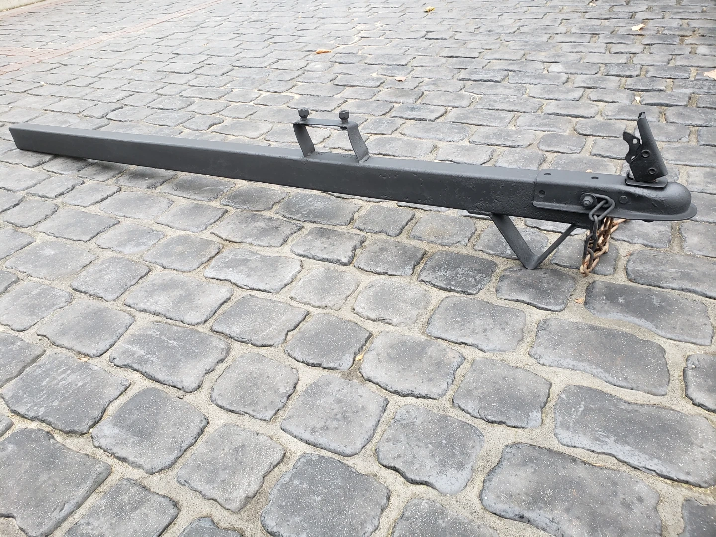 This is a trailer hitch coupler assembly with an attached safety chain. It appears to be made of heavy-duty steel and is painted black. The coupler is designed to attach to a trailer ball for towing. This assembly would be useful for anyone needing to tow a trailer and requiring a secure hitching mechanism.