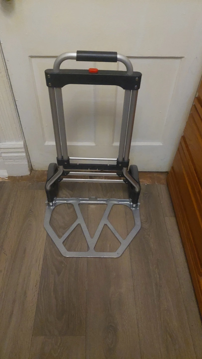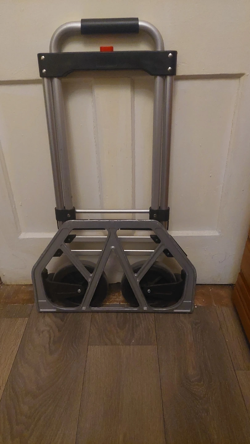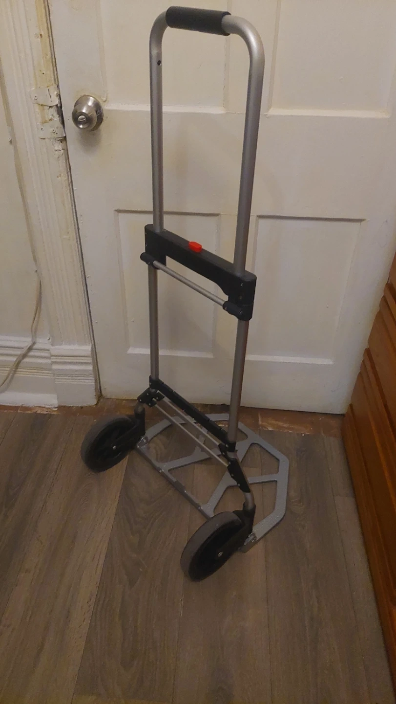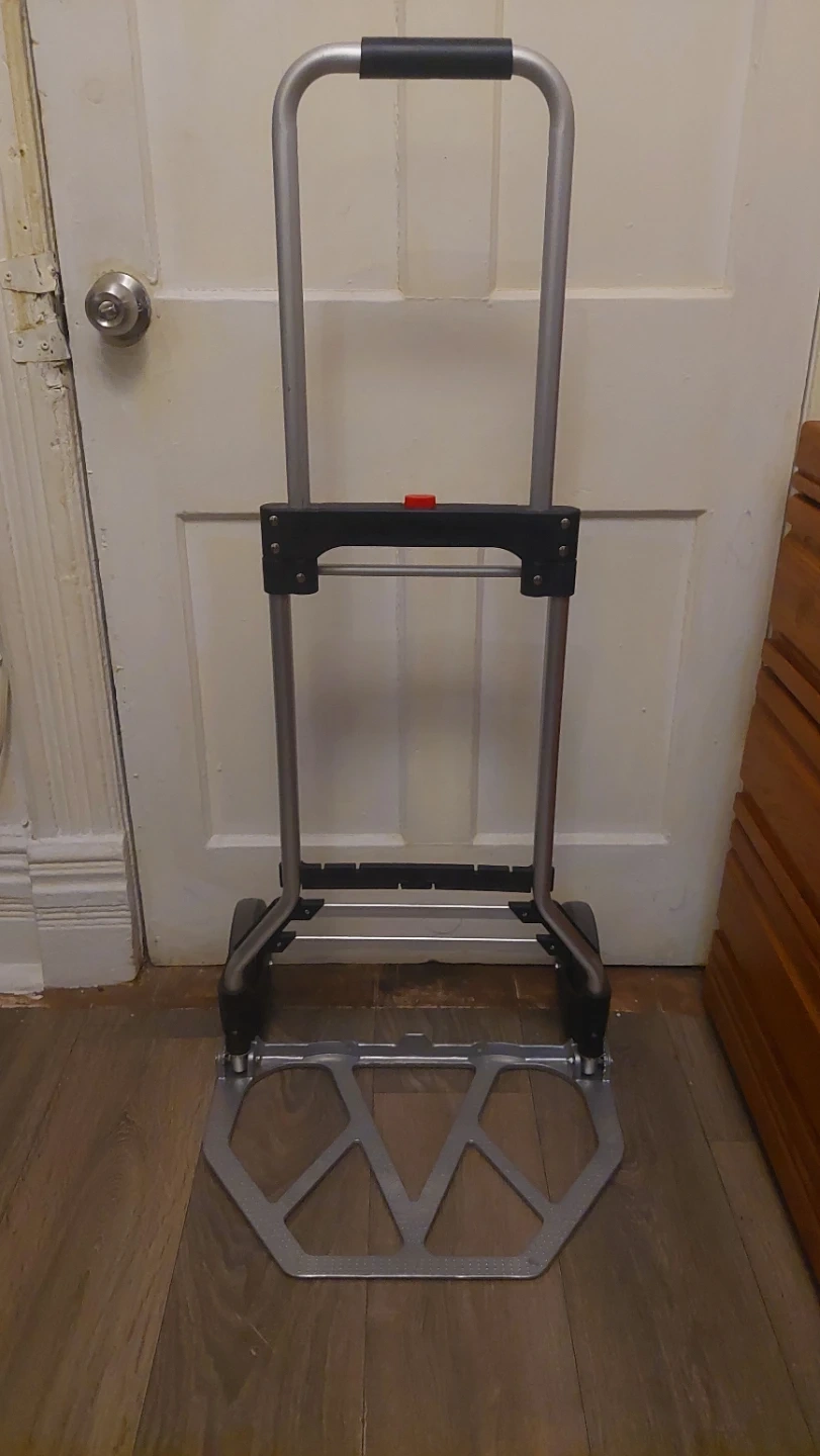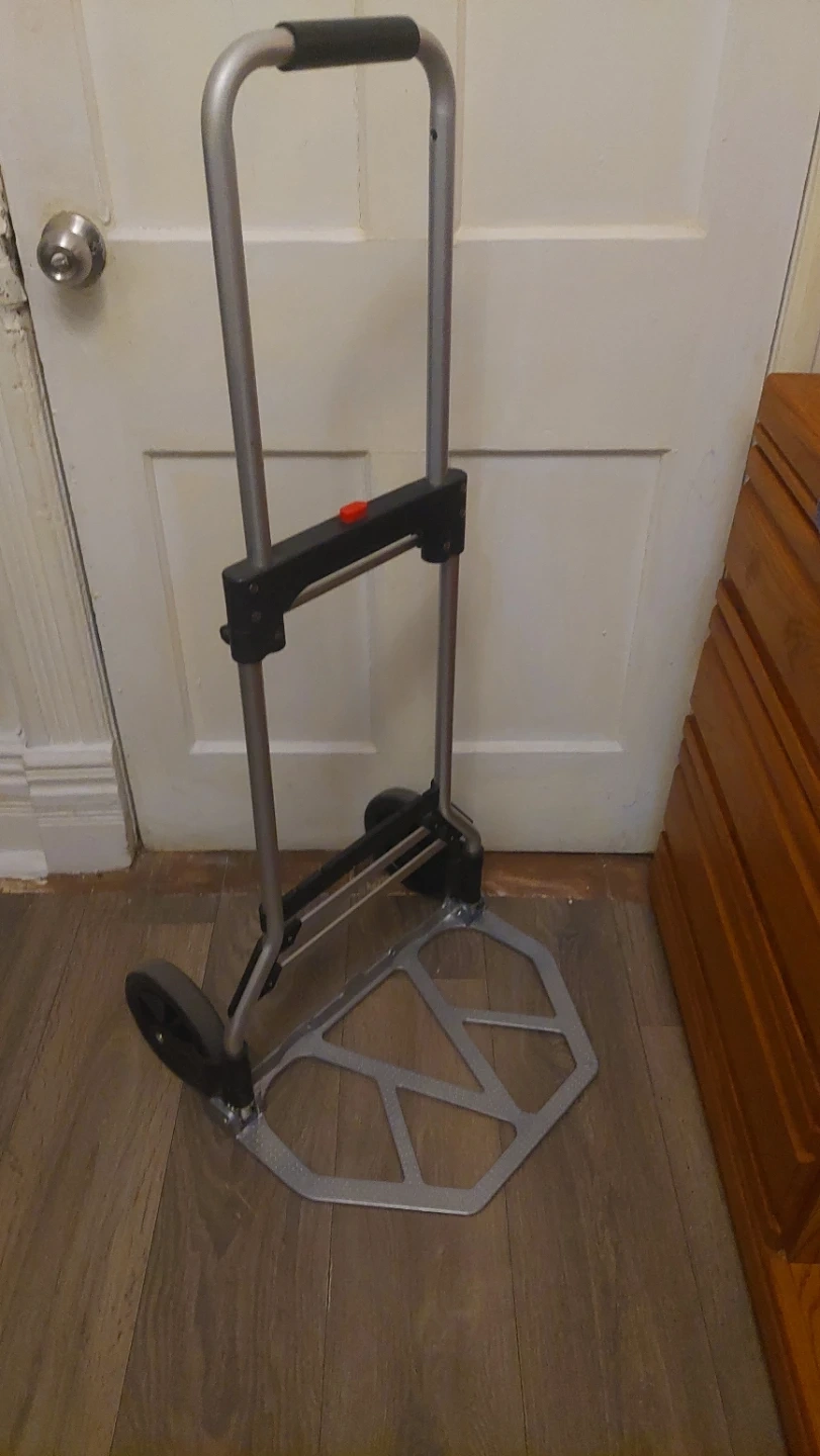 This is a folding hand truck dolly cart. It's made of aluminum and plastic. It folds flat for easy storage and transport, has 6 1/2 inch wheels.Pick up only, Davenport Road and Symington Avenue.