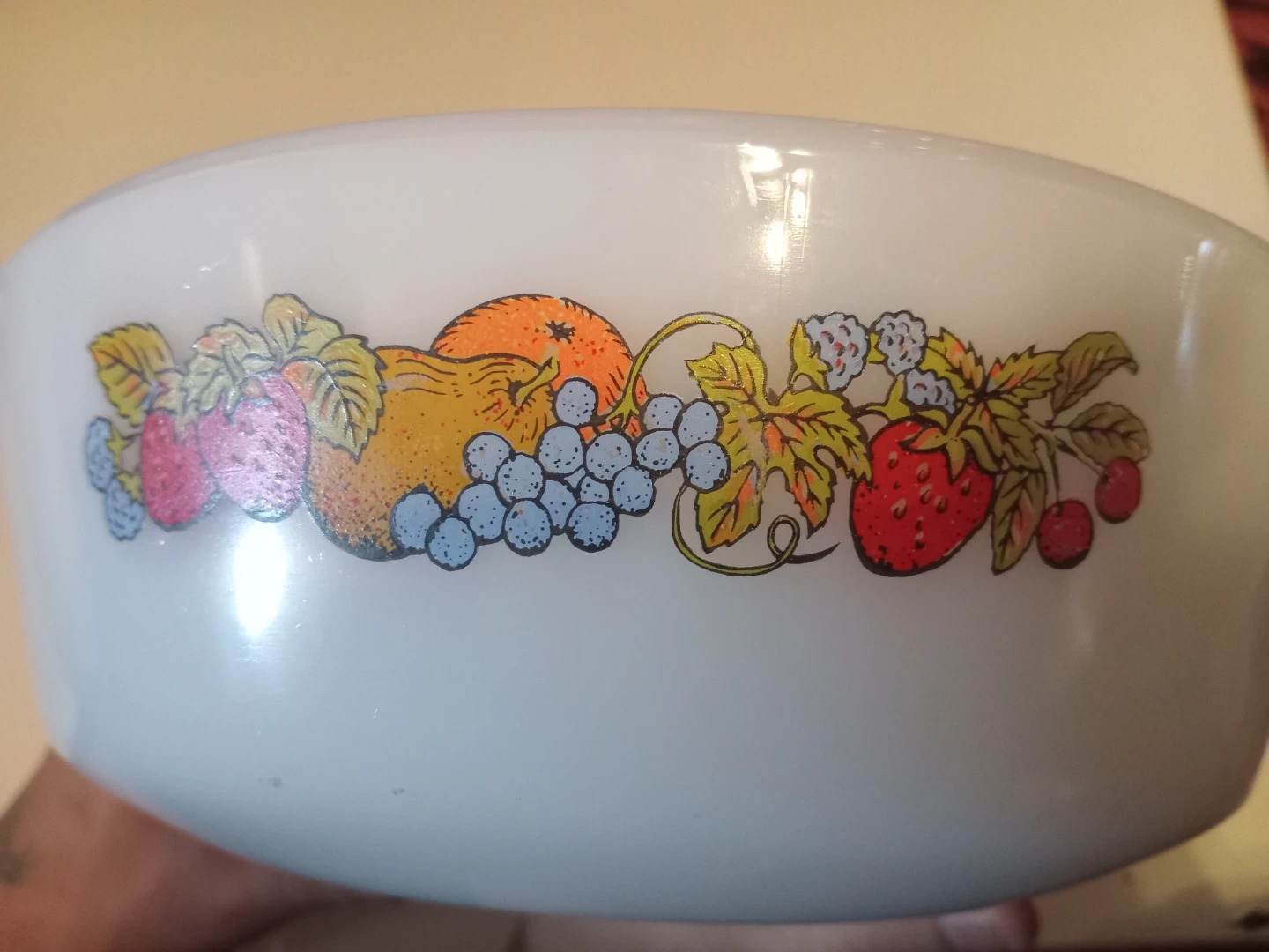 Retro white milk glass casserole dish with a colourful fruit decal. This dish has two handles and a classic design. It's perfect for baking or serving your favourite dishes!