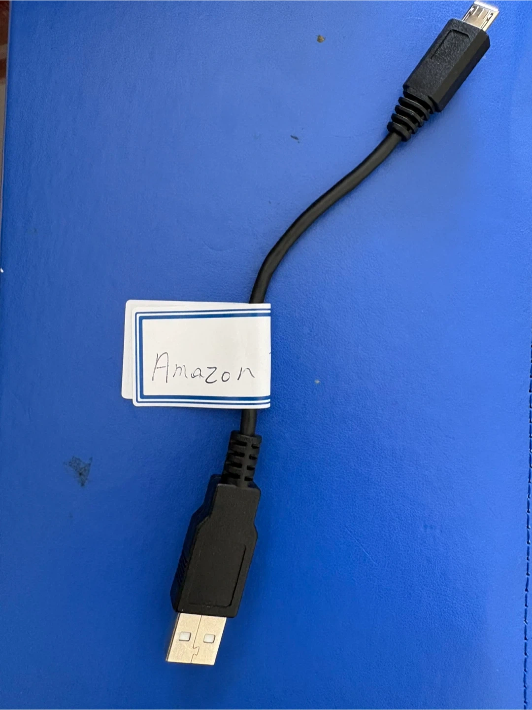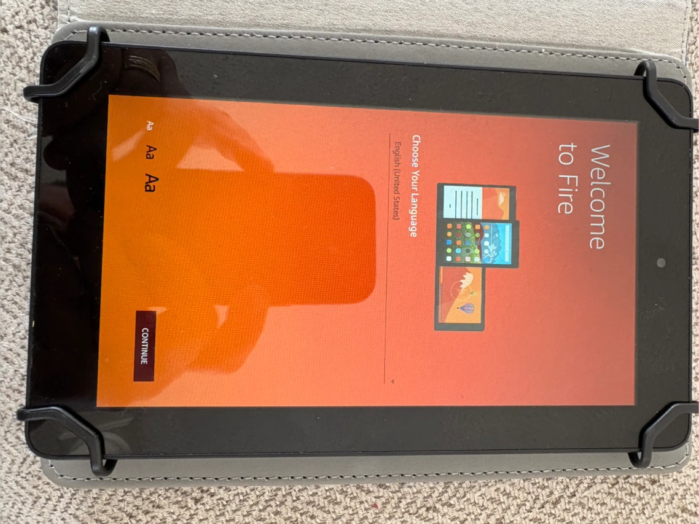 This is an Amazon Fire tablet, a handy device for everyday use. It comes with a protective blue case and a charging cable labelled 'Amazon'. The tablet is powered on and ready for setup.