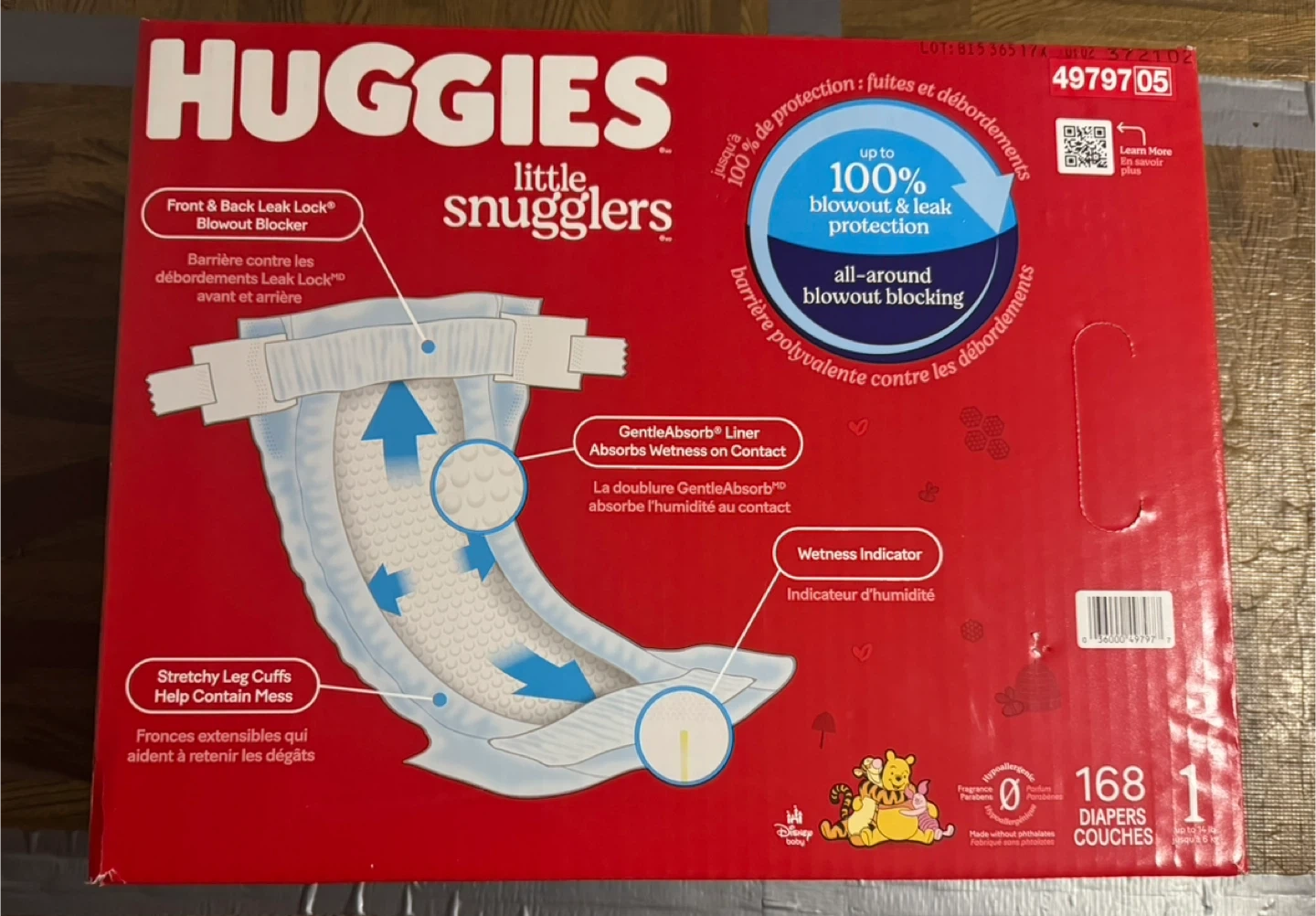 These Huggies Little Snugglers diapers offer up to 100% blowout and leak protection with a GentleAbsorb Liner. They feature stretchy cuffs to help contain messes and a wetness indicator. This box contains 168 diapers suitable for babies up to 14 lbs.