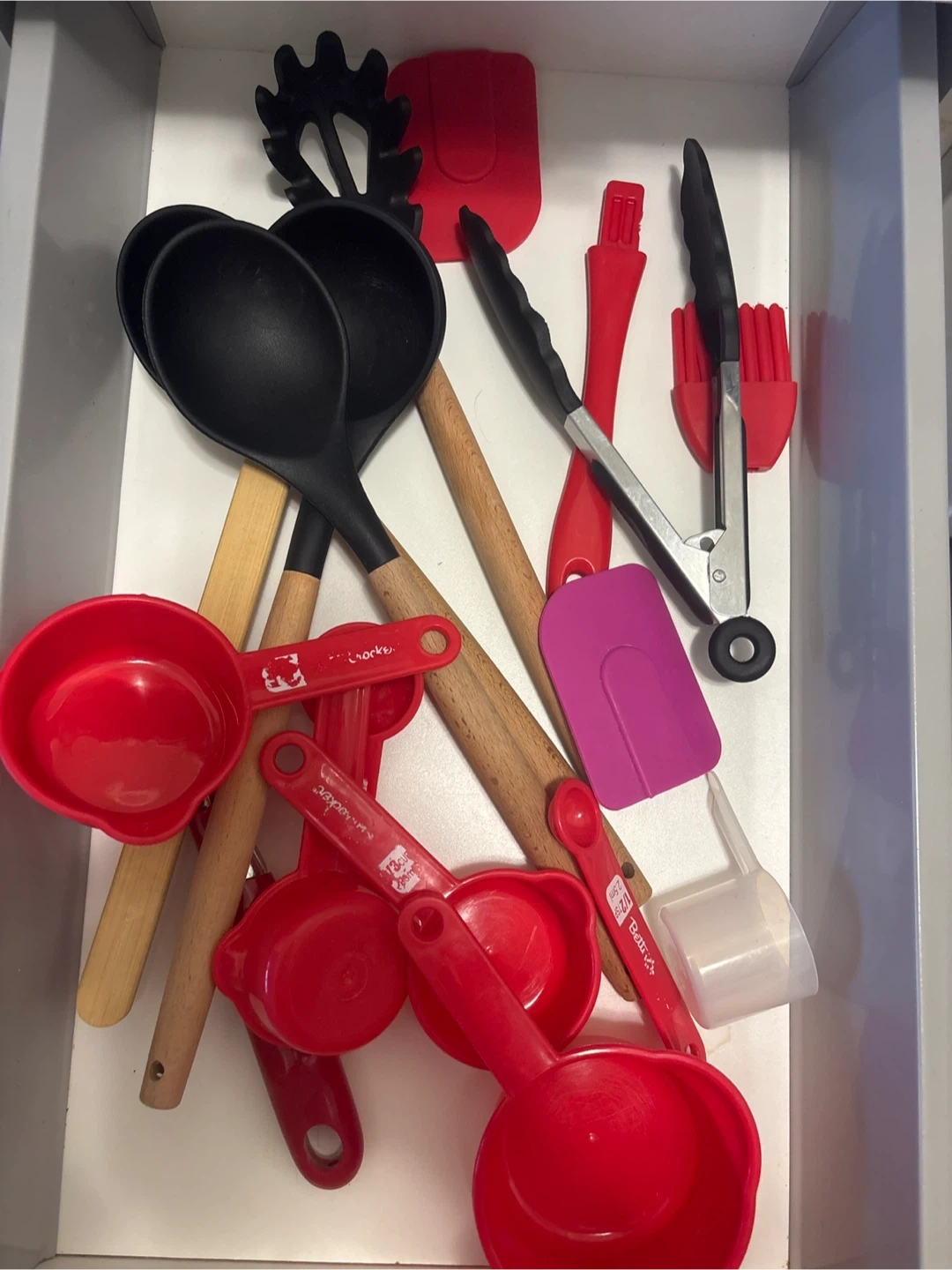This set includes various kitchen utensils like spatulas, ladles, and a pasta server. It also comes with a set of red measuring cups and spoons for baking and cooking. Utensils feature wooden handles and silicone heads. and more!
