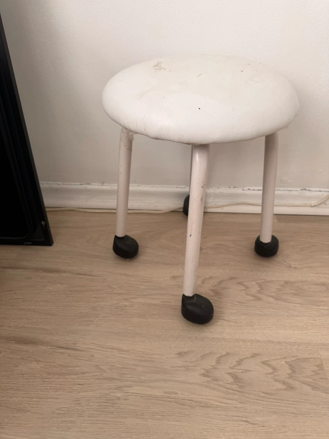 This is a simple white round stool with four legs. It's made of metal with black plastic feet. It's a handy extra seat for any room.