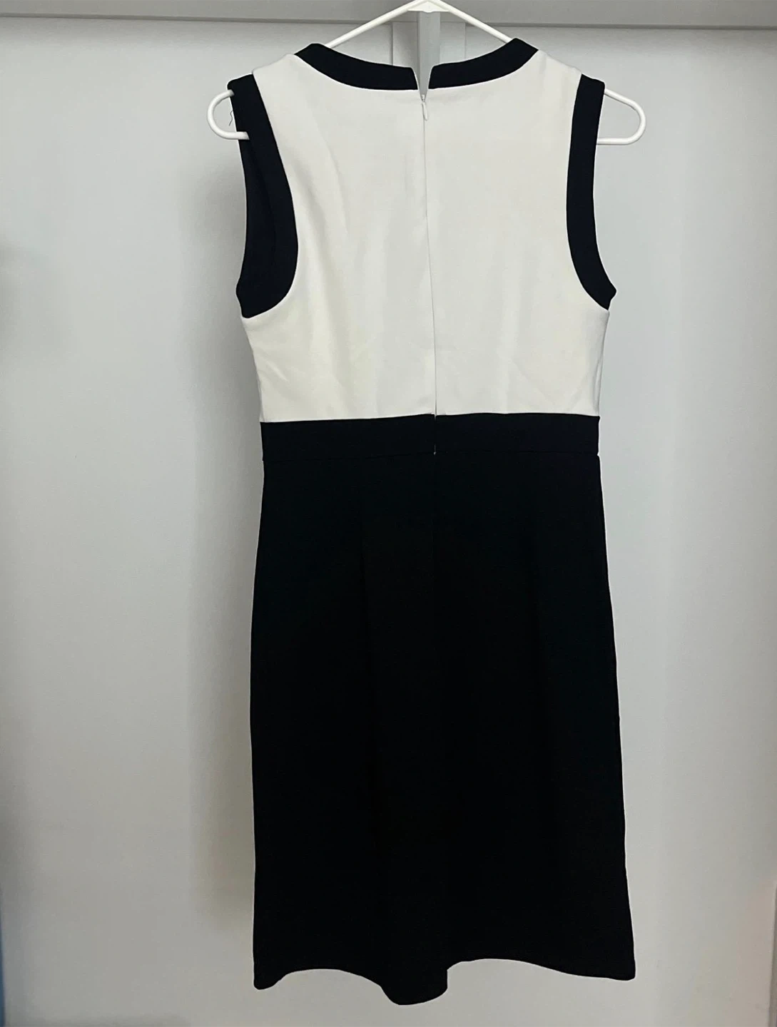This is a white and black sleeveless sheath dress. It has a V-neckline with black trim and decorative knot details at the bust. The dress zips up the back. A classic addition to any wardrobe!