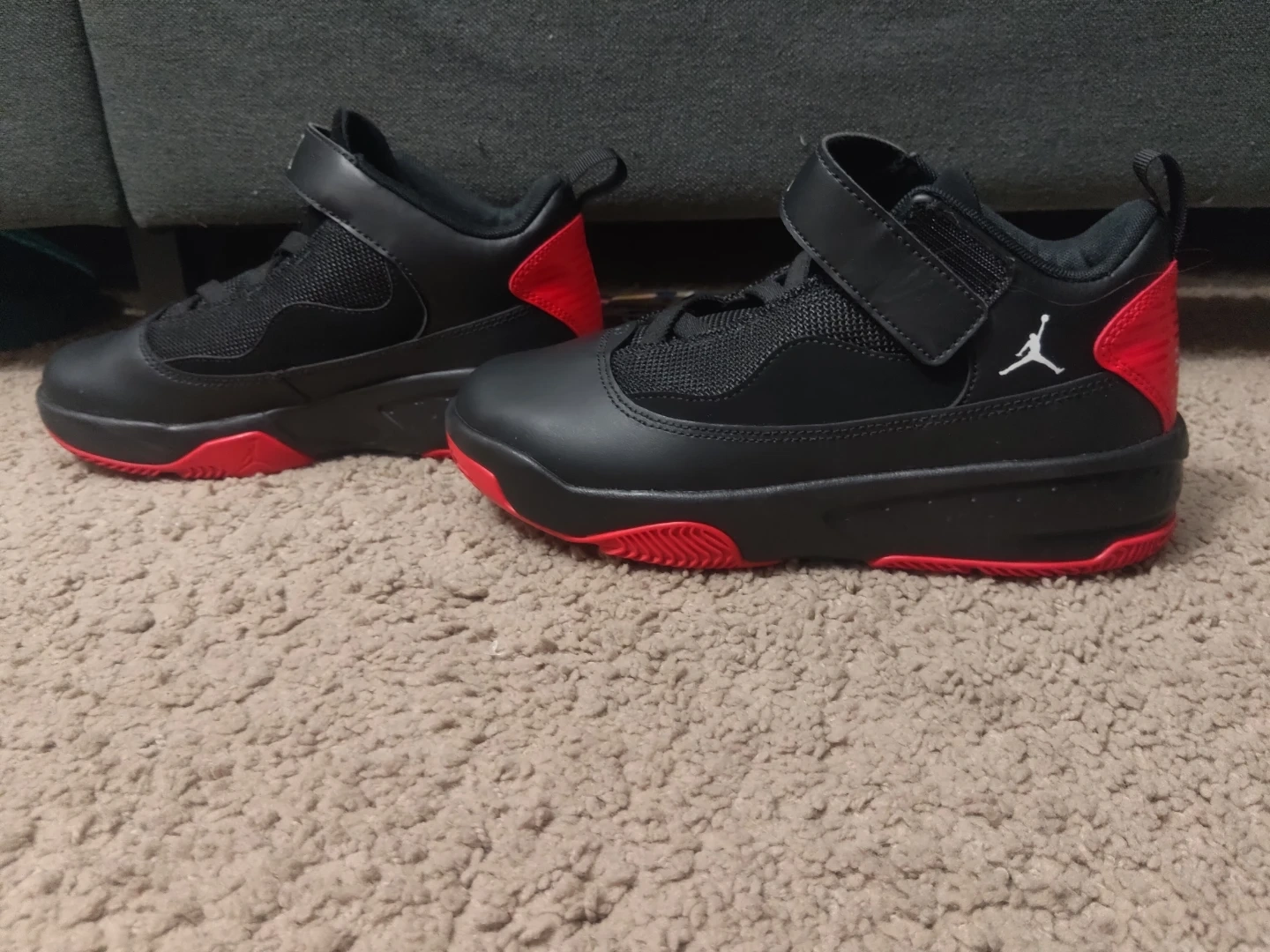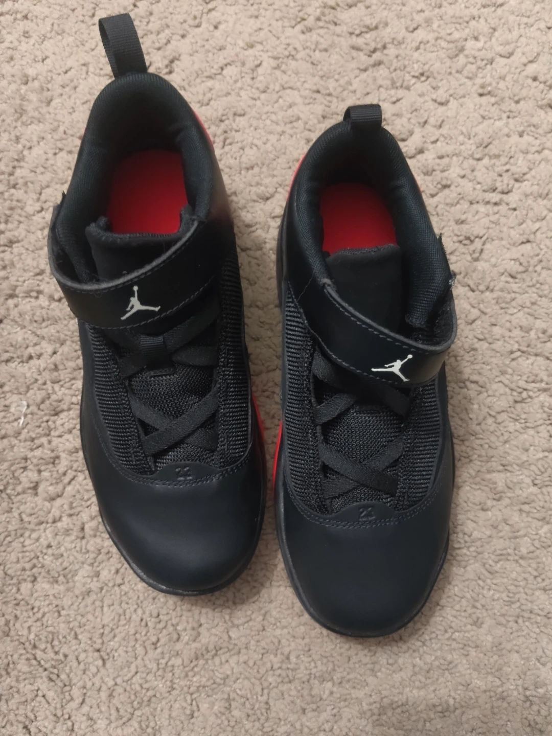 Youth Jordan sneakers in black with red accents. Velcro strap closure and laces. Size 2Y.