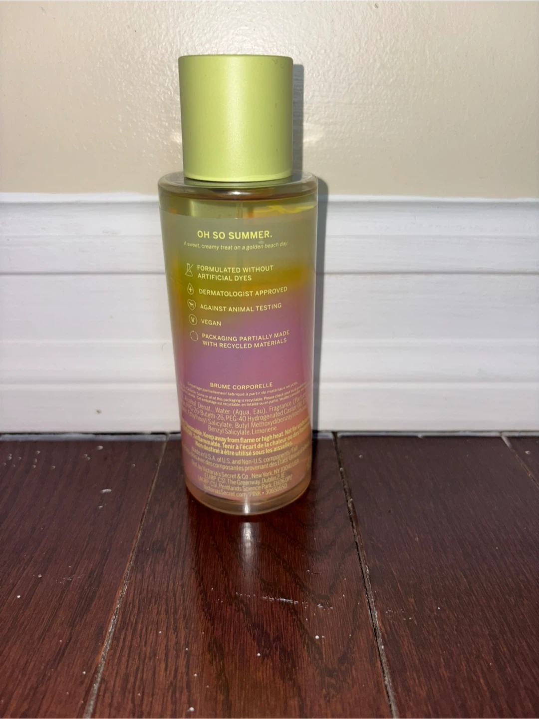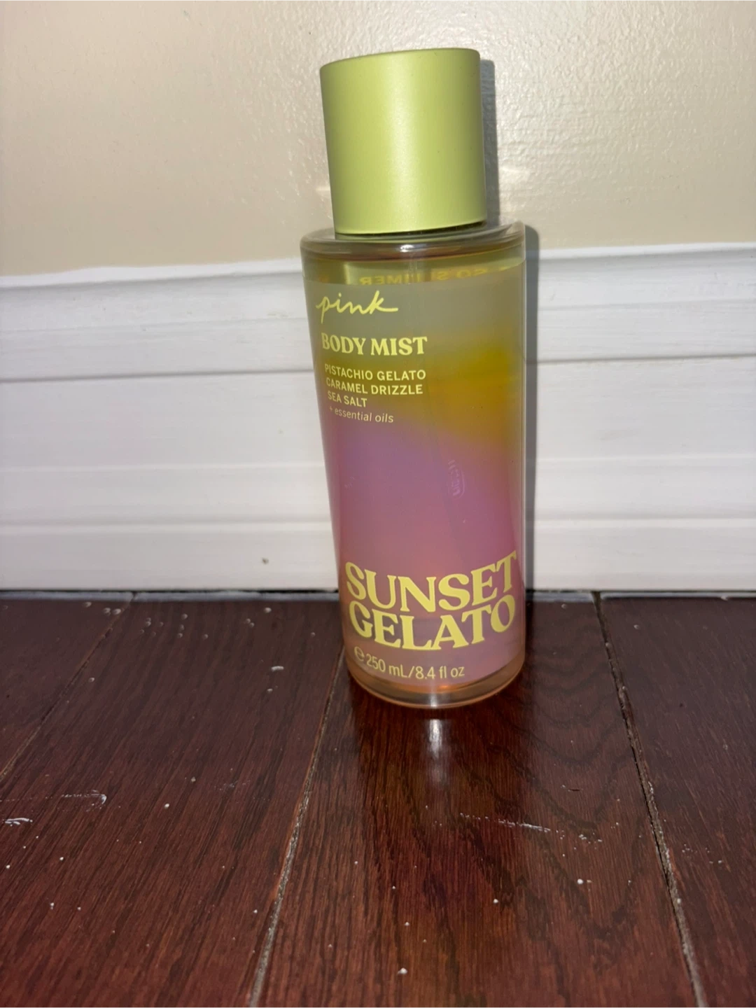 Victoria's Secret PINK Sunset Gelato body mist. Features a pistachio gelato, caramel drizzle, and sea salt scent with essential oils. This mist is 250 ml or 8.4 fl oz. It's formulated without artificial dyes and is vegan.