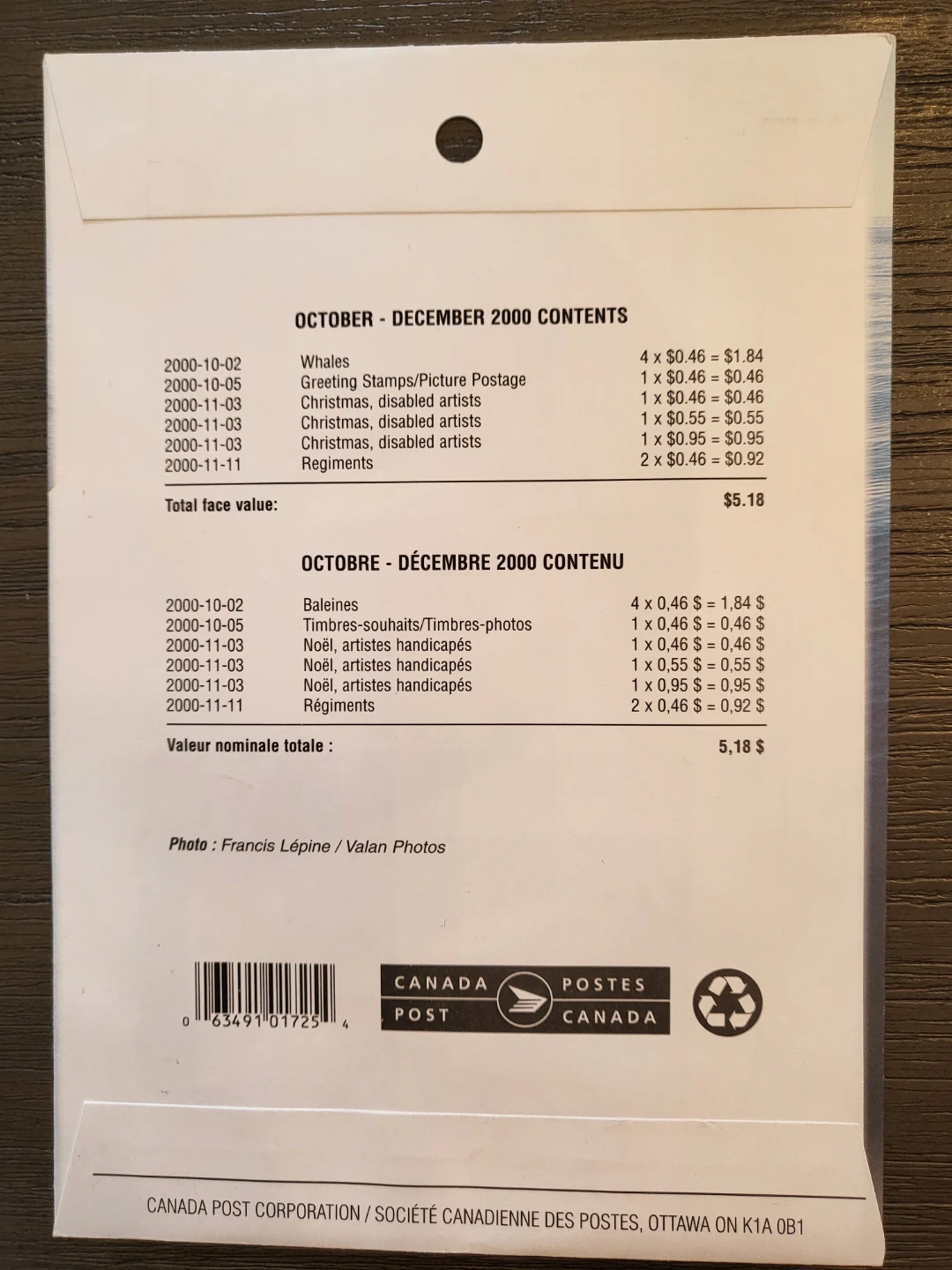 This is a collector's set of stamps from Canada issued between October and December of 2000.