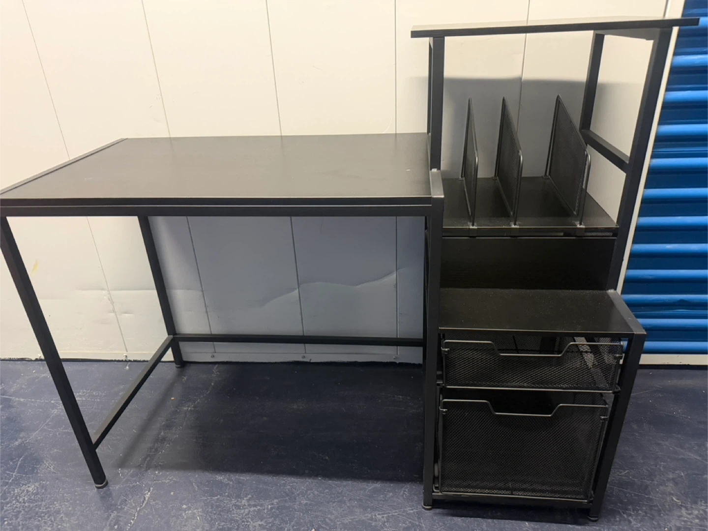 This black metal desk features a spacious tabletop and integrated storage. It includes vertical shelves for organizing documents and two mesh bins for smaller items. Its streamlined design makes it a functional addition to any workspace.