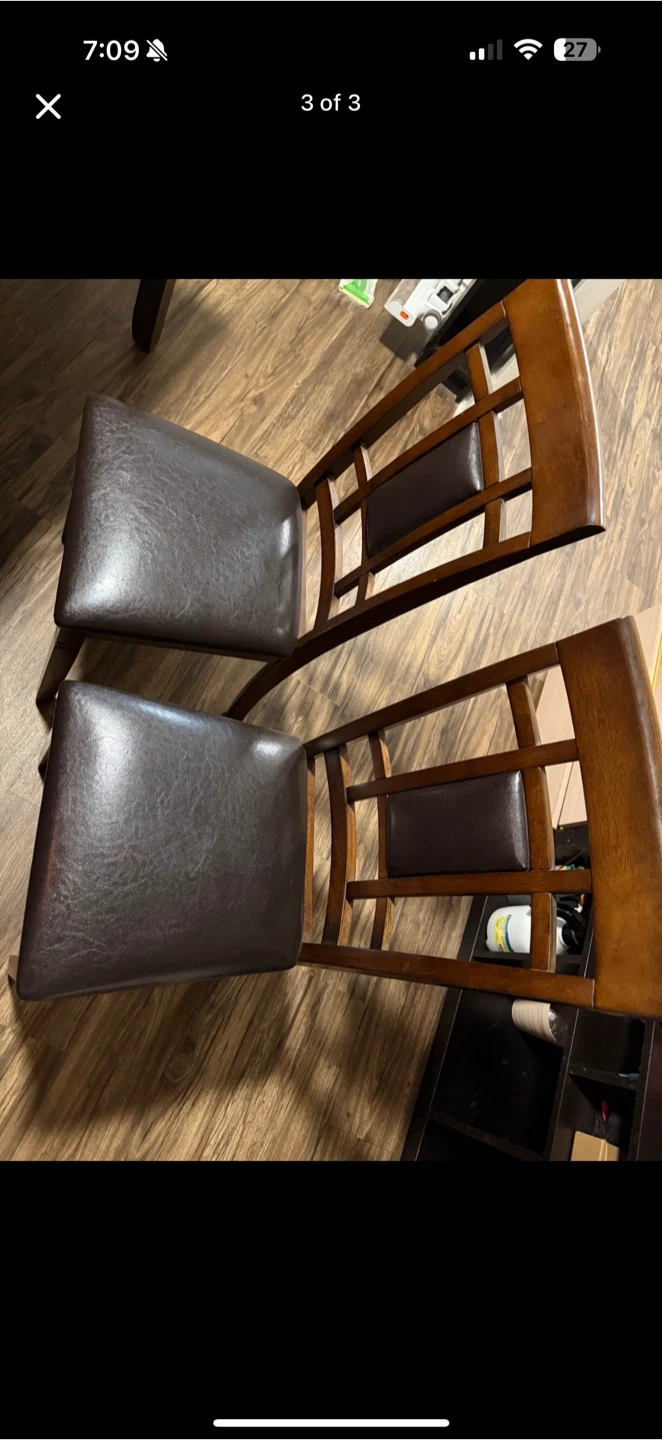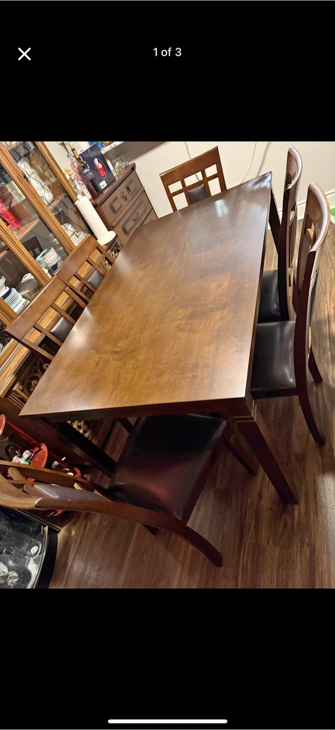 Selling a dining table with six chairs. The set features a wooden table and chairs with dark brown leather seats. It's in good condition and ready for a new home!