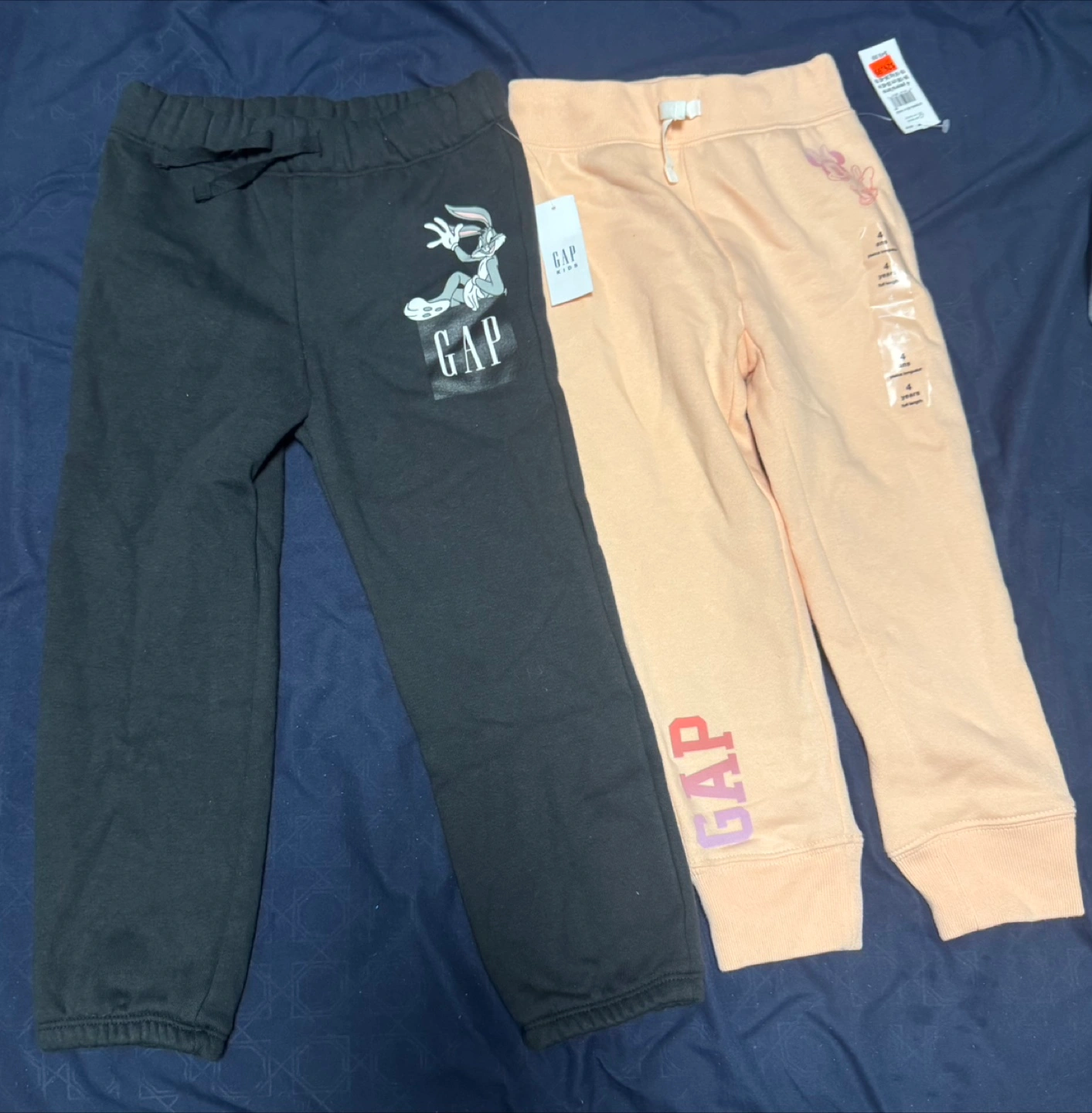 Two pairs of Gap Kids sweatpants! One is black with a Bugs Bunny graphic, and the other is a light peach colour with the GAP logo down the leg. Both are size 4 and in great condition!