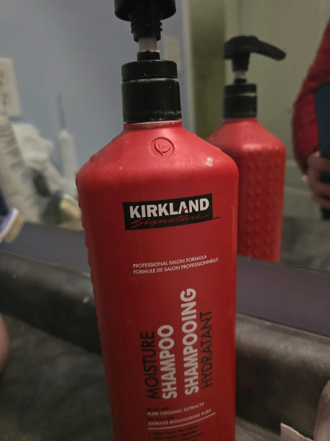 Kirkland Signature Moisture Shampoo in a large pump bottle. Professional salon formula made with pure organic extracts. This shampoo is hydrating and comes in a 33.8 fl oz size. 70% remain.