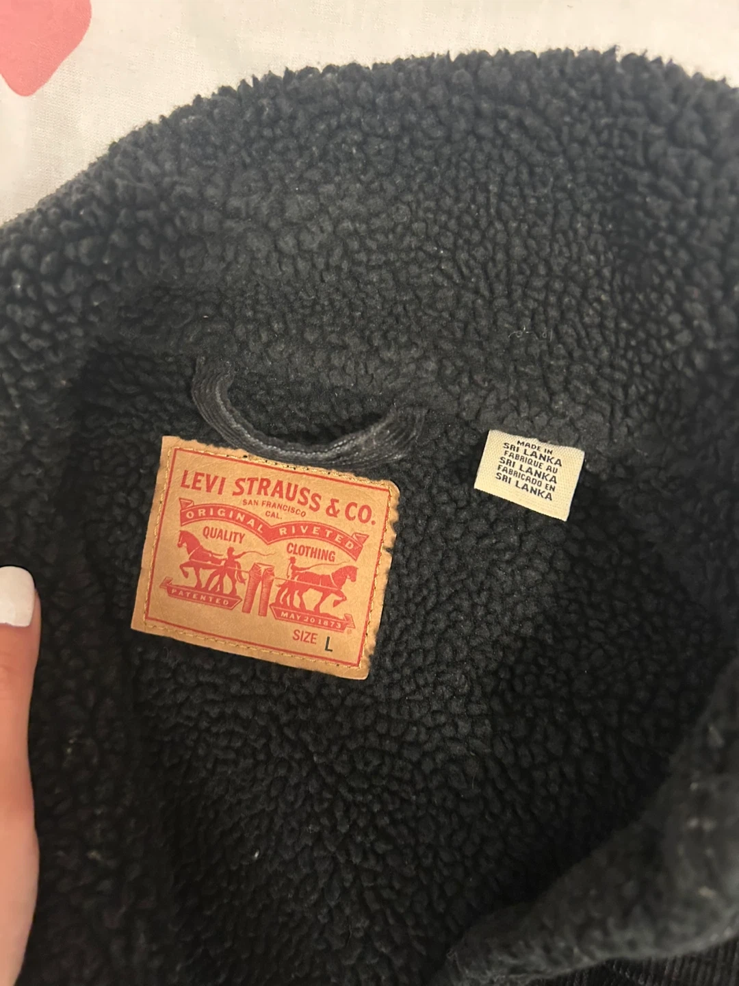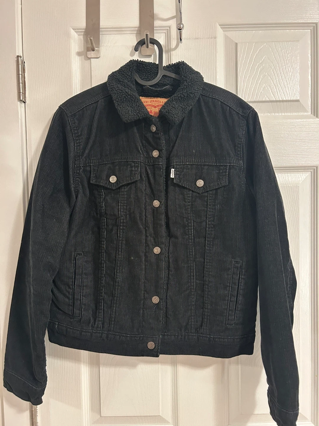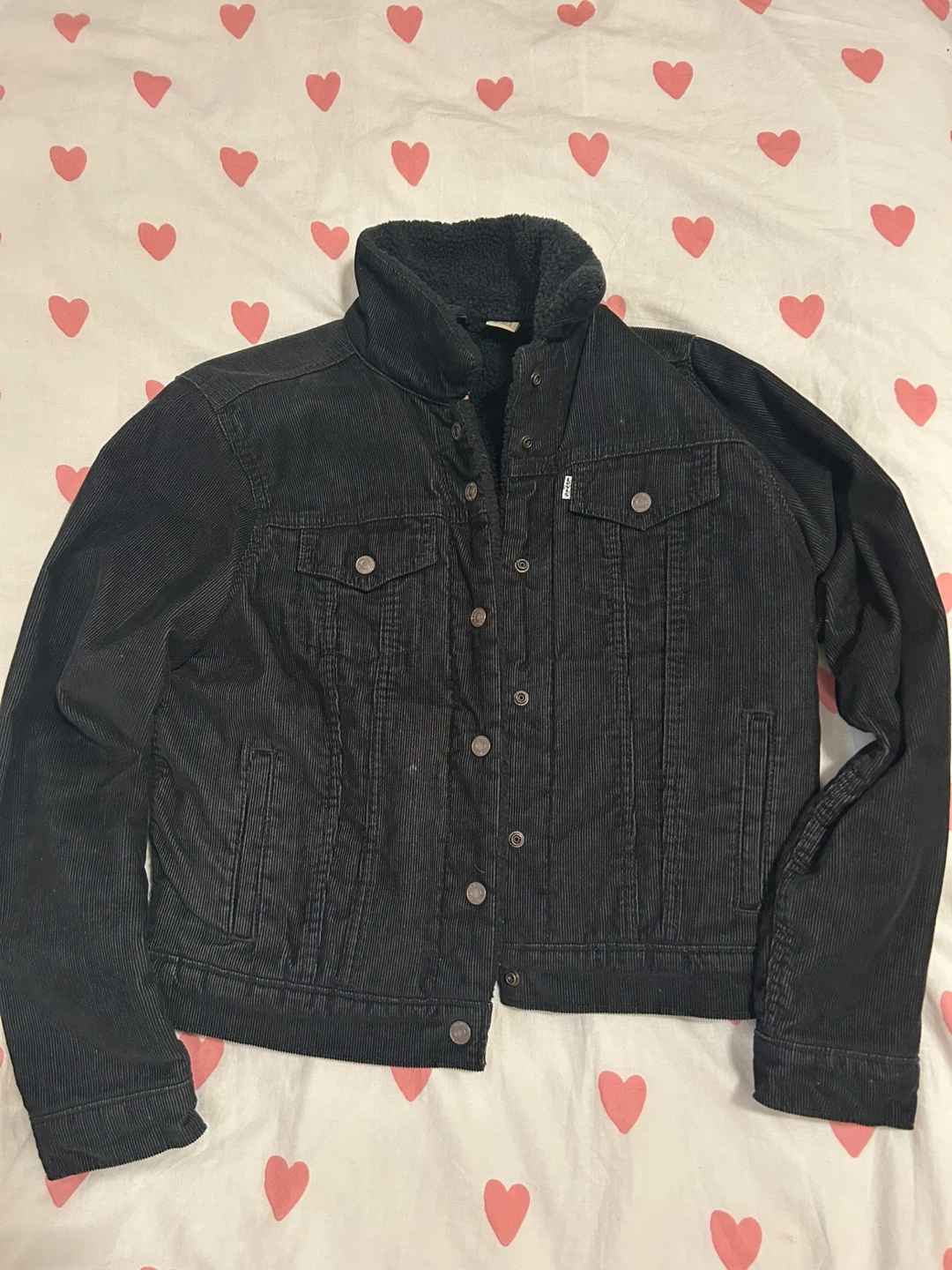 Selling a Levi's black corduroy sherpa trucker jacket in size L. It's in great condition and ready to keep you warm!