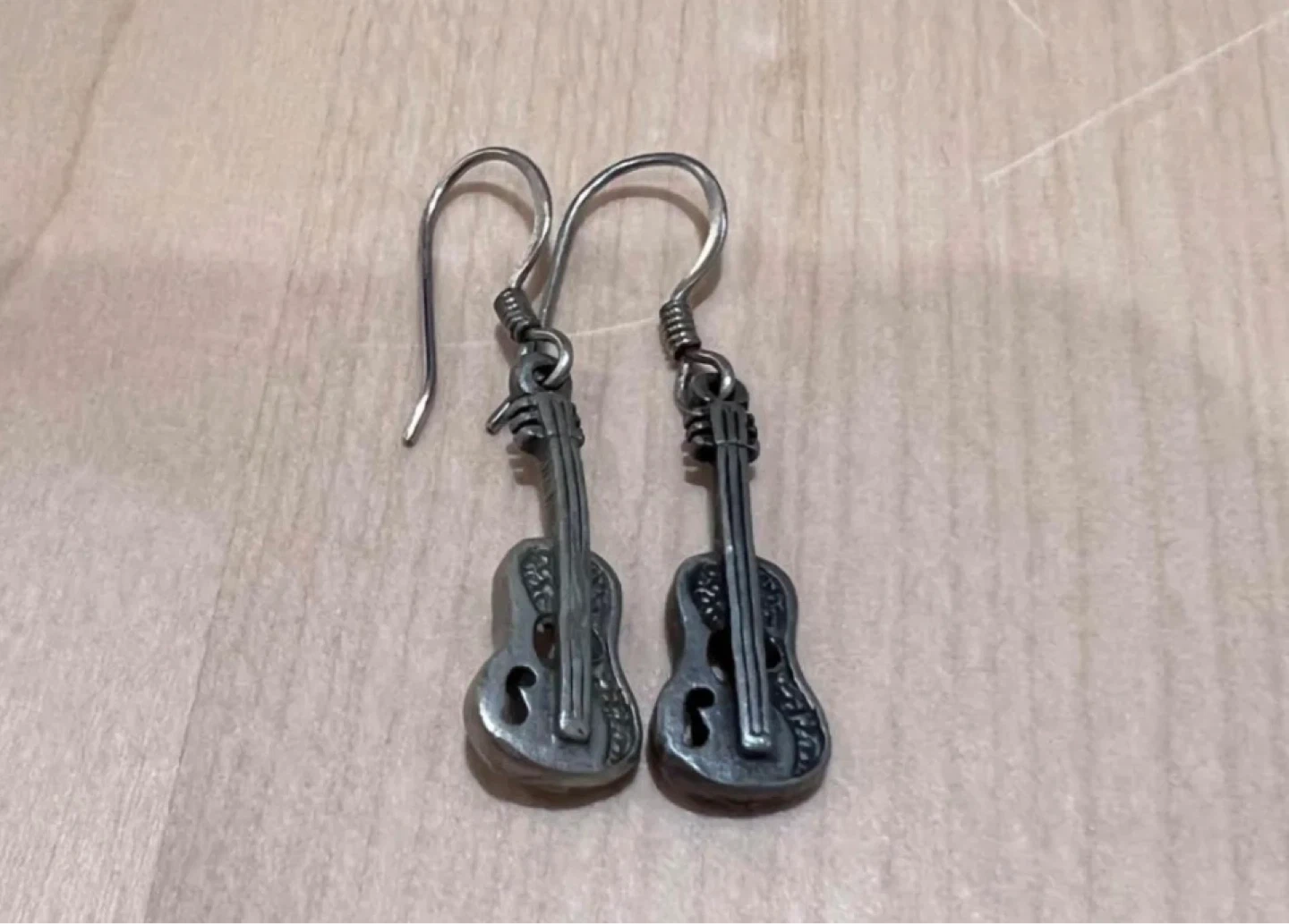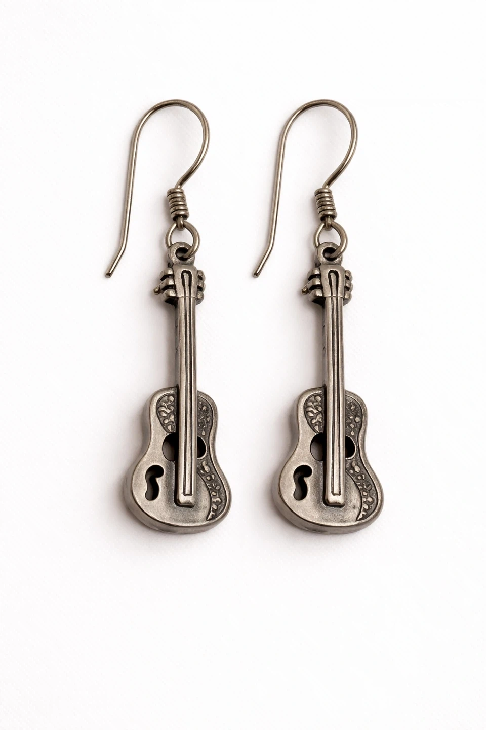 Unique guitar-shaped earrings with a detailed design and antique-style finish. Lightweight and easy to wear, perfect for music lovers or adding a subtle statement to any outfit.