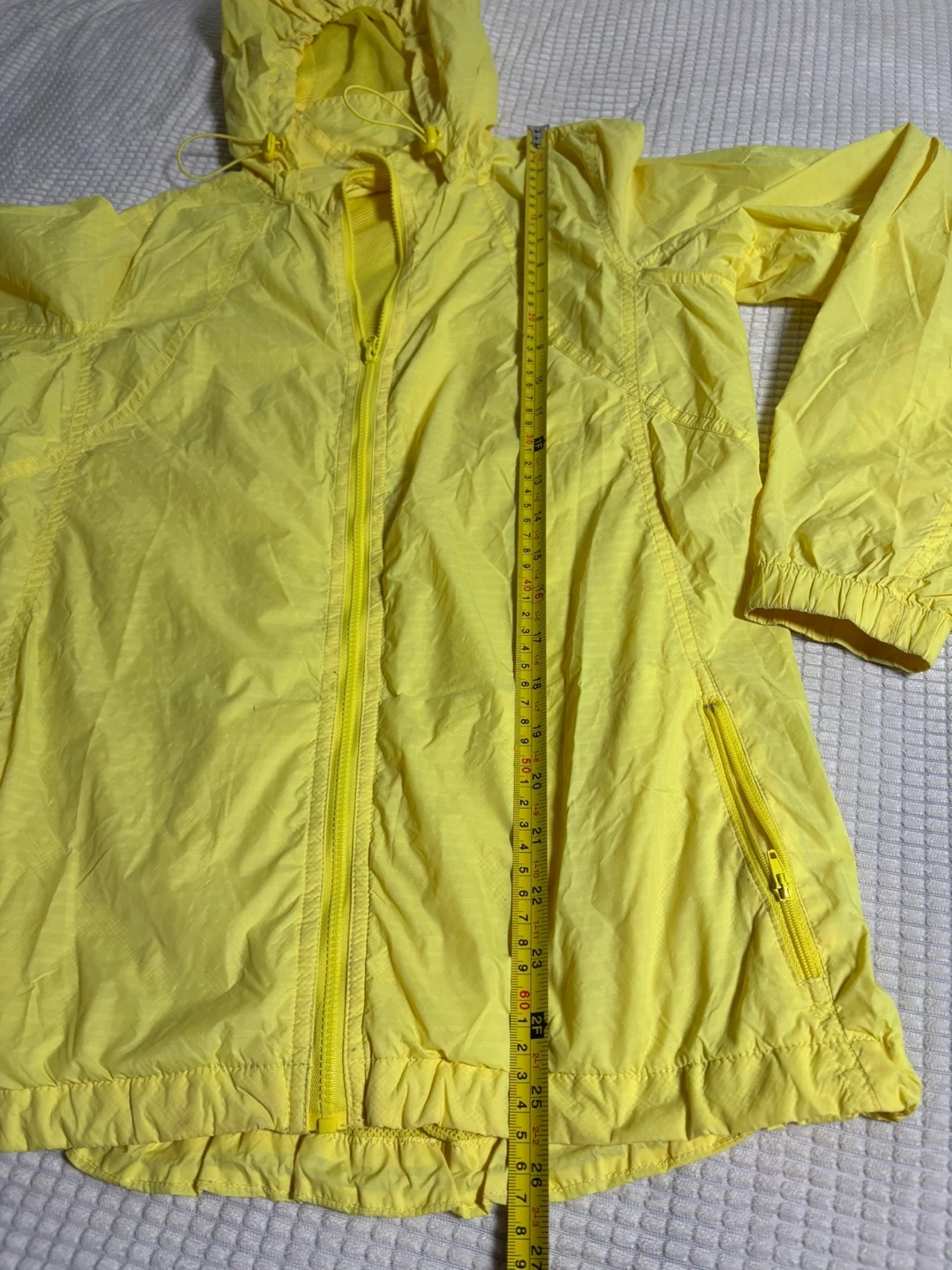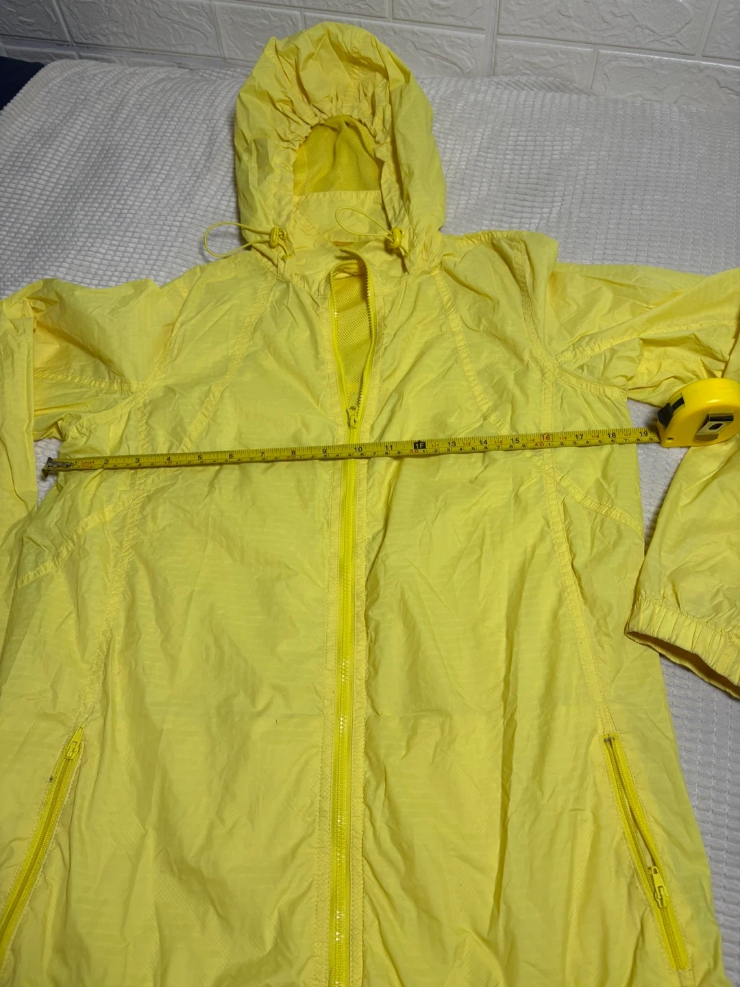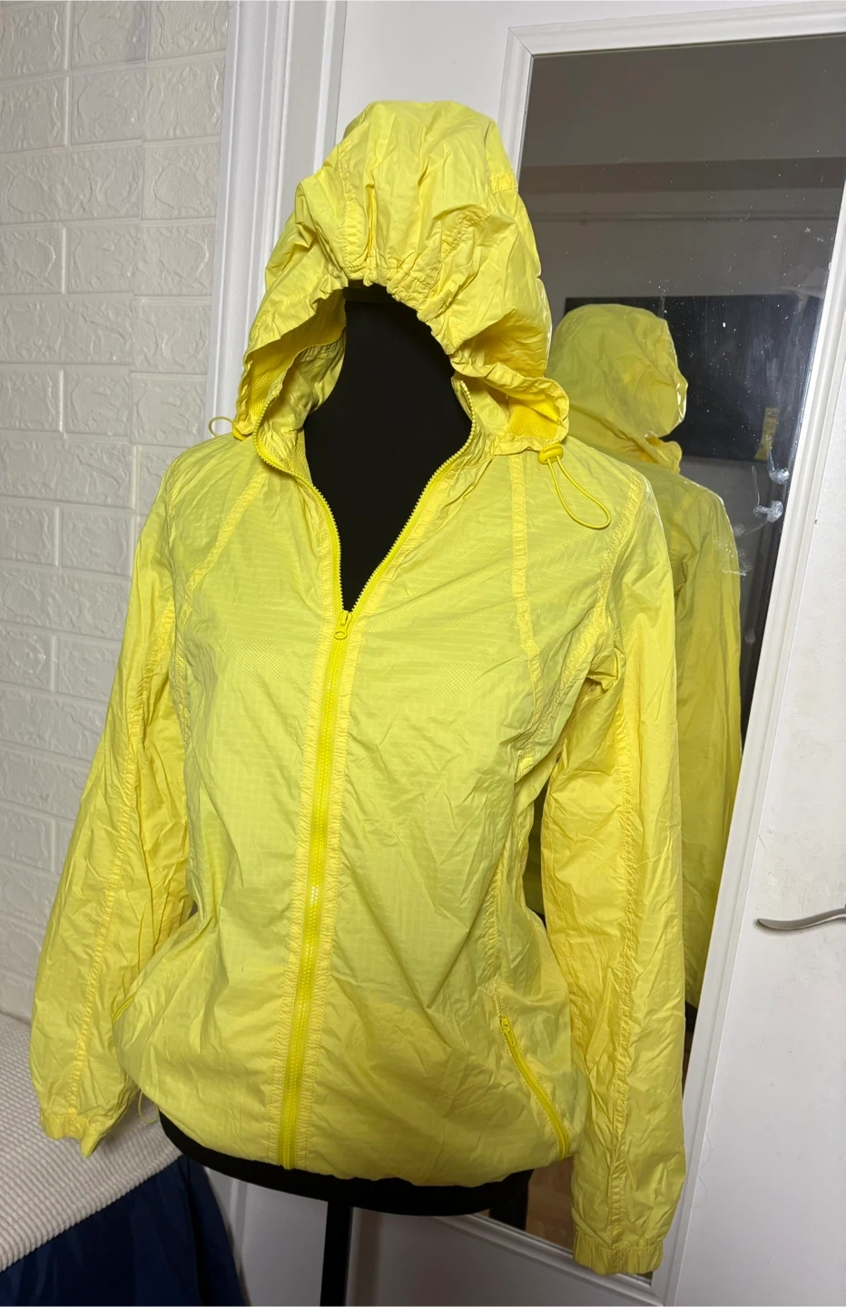 This is a lightweight, hooded jacket in a bright yellow color. It features a full zip closure and two front pockets. It's made from a crinkly, possibly water-resistant material.