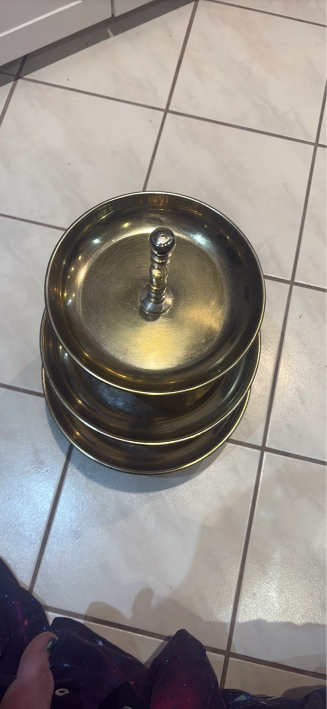 Brass 3-tier serving stand for snacks or appetizers. It's a sturdy piece with a decorative central column. This stand's perfect for parties or special occasions! this is a vintage collectable