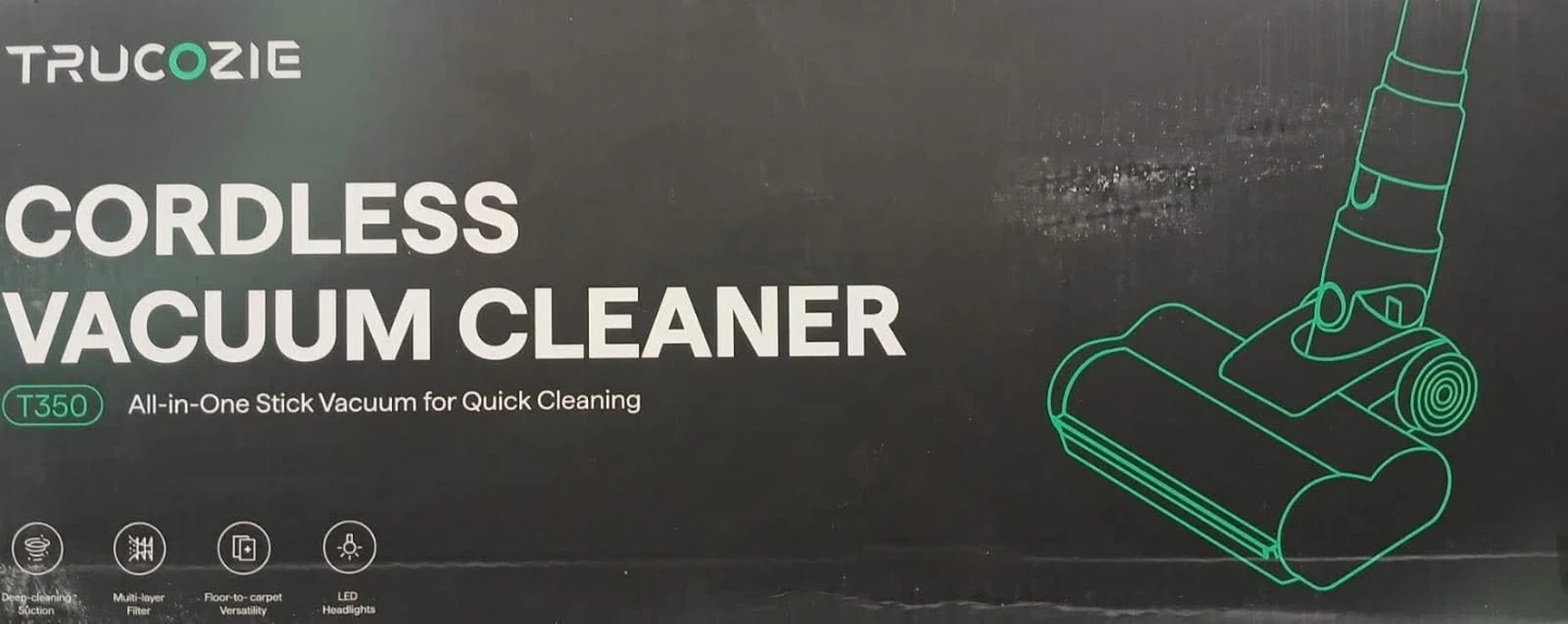 Brand new cordless vacuum. Never used this one, have a similar one already so no use for it. It's a TRUCOZIE T350 All-in-One Stick Vacuum for quick cleaning. Has deep-cleaning suction, multi-layer filter, floor-to-carpet versatility, and LED headlights.