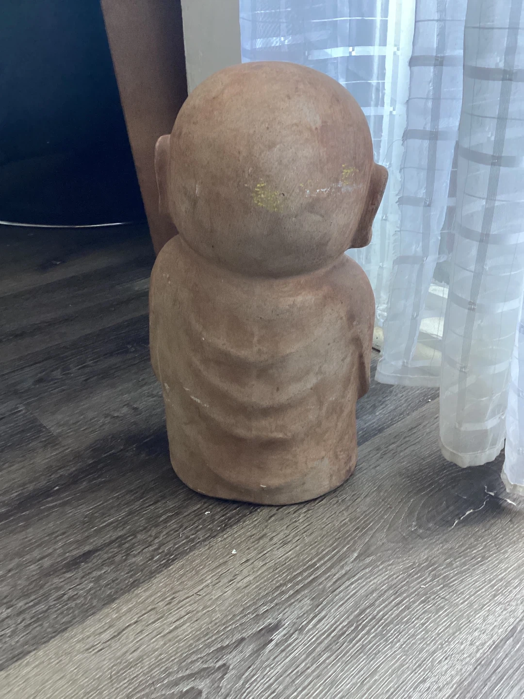 This is a charming terracotta statue of a praying monk. It's hollow and would make a nice decorative piece. It's made of clay and has a rustic, weathered look.