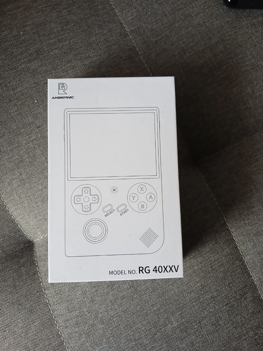 This is an Anbernic RG40XXV handheld game console. It features a classic gamepad layout with a D-pad, face buttons, and shoulder buttons. It's designed for playing retro games.