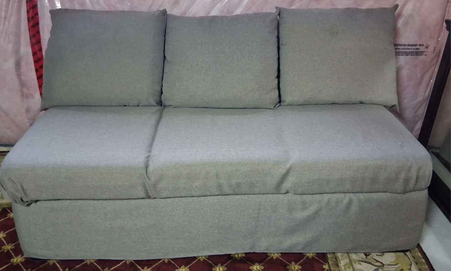 This is a loveseat sofa with three back cushions and three seat cushions. It has a skirted base. Upholstered in a durable fabric.