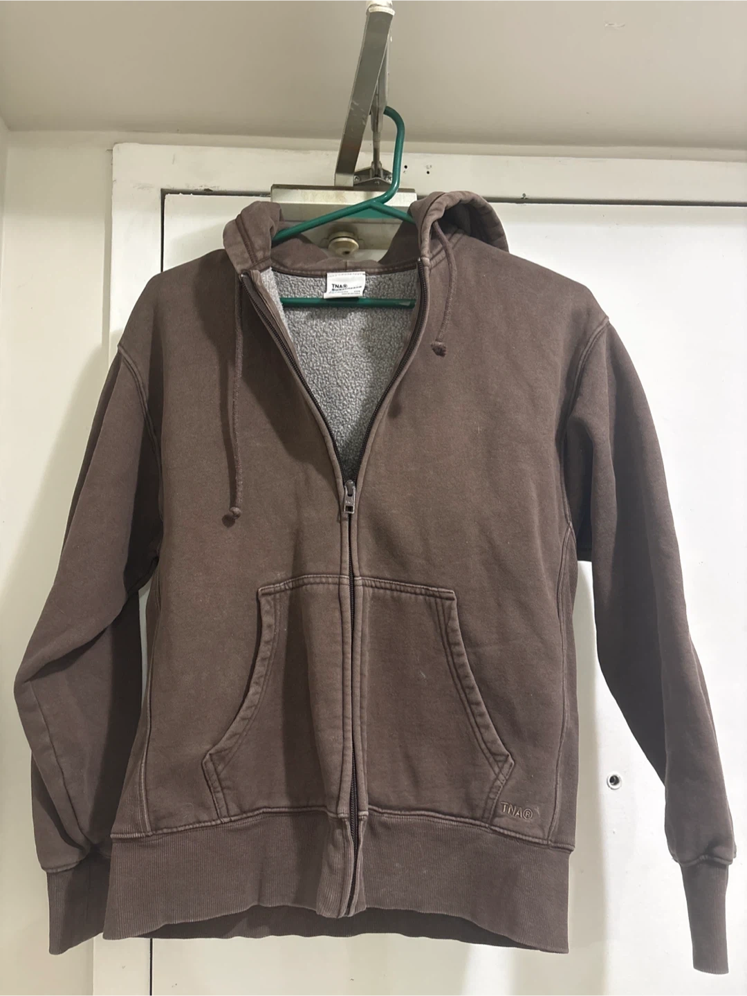 A classic brown zip-up hoodie from TNA. It's lined with a soft fleece material for extra warmth. This hoodie is perfect for casual wear on cooler days.