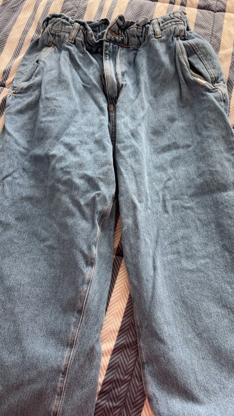 Pair of light wash denim jeans. High-waisted, relaxed fit. Elastic waistband. Size 30. Made in Turkey.