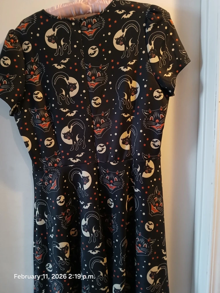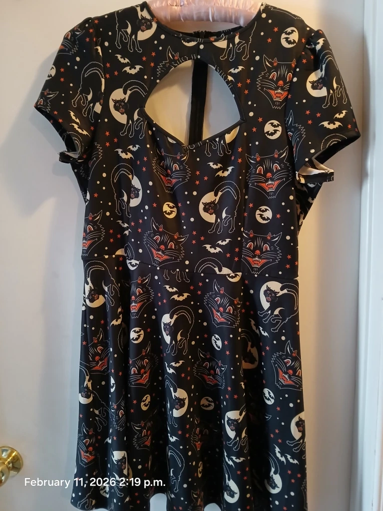 Sourpuss dress with a fun Halloween print. Size XL. Features cats, pumpkins, and skulls. Great for spooky season or for that Gothic daily look. Only warn once๐