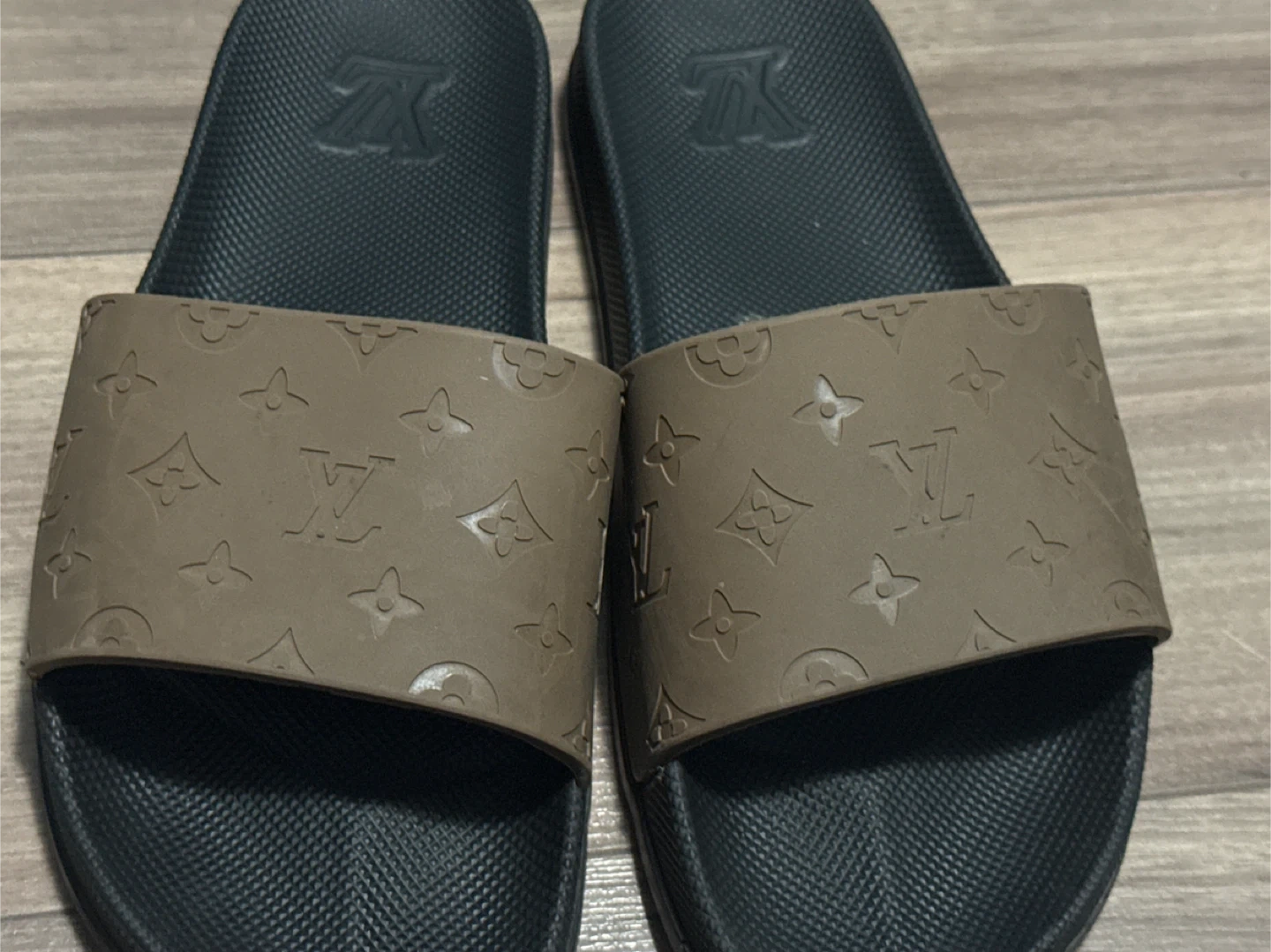 These Louis Vuitton slides feature the classic monogram pattern. They're a stylish and comfortable option for casual wear. The base is black with a tan strap.