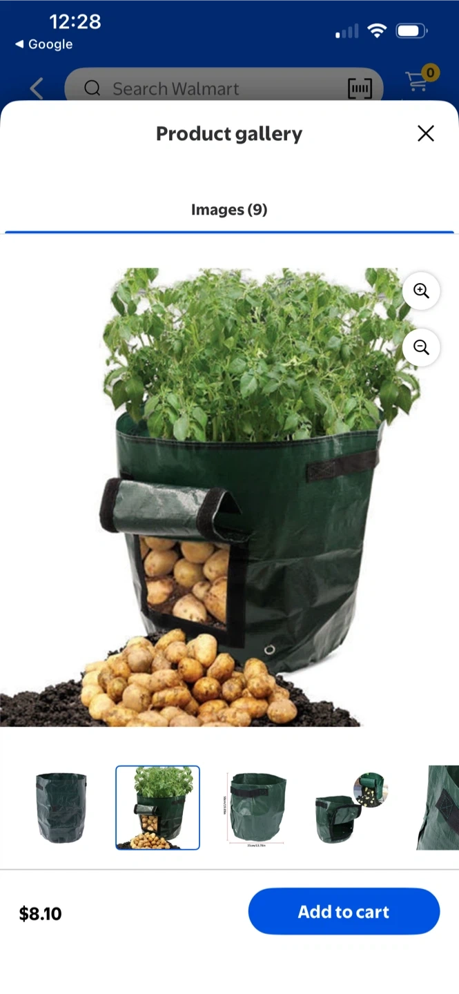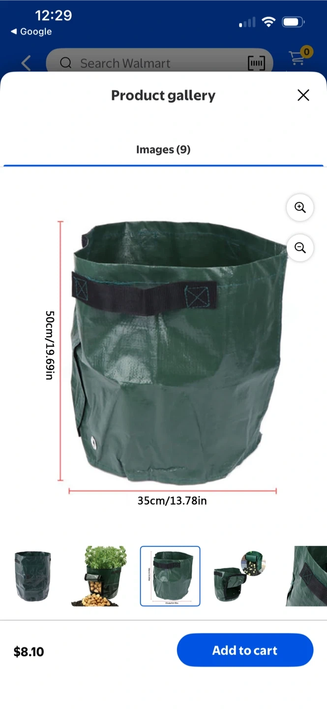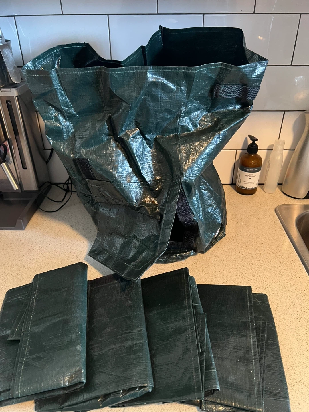 This is a sturdy green grow bag planter. It's made of durable material and features reinforced handles. It's great for growing potatoes or other vegetables. It measures 35cm wide and 50cm tall.