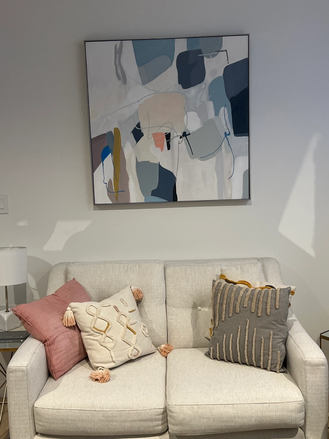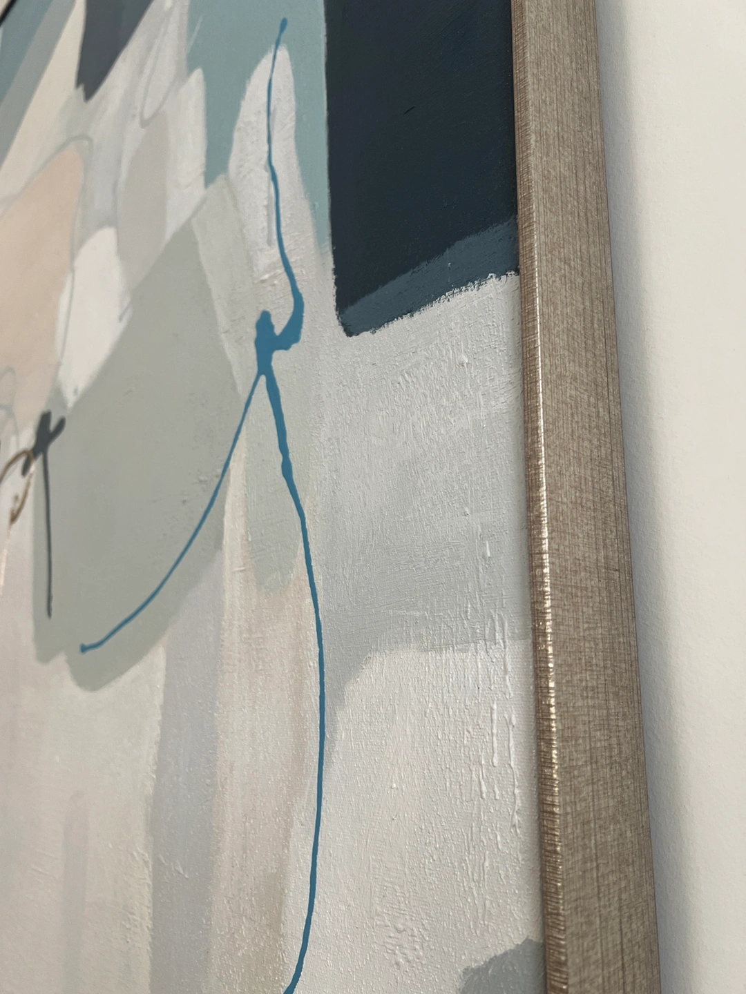 Add a touch of modern art to your space with this abstract print. It features a palette of blues, greys, and a hint of blush pink. The canvas is framed and ready to hang, bringing a contemporary feel to any room.