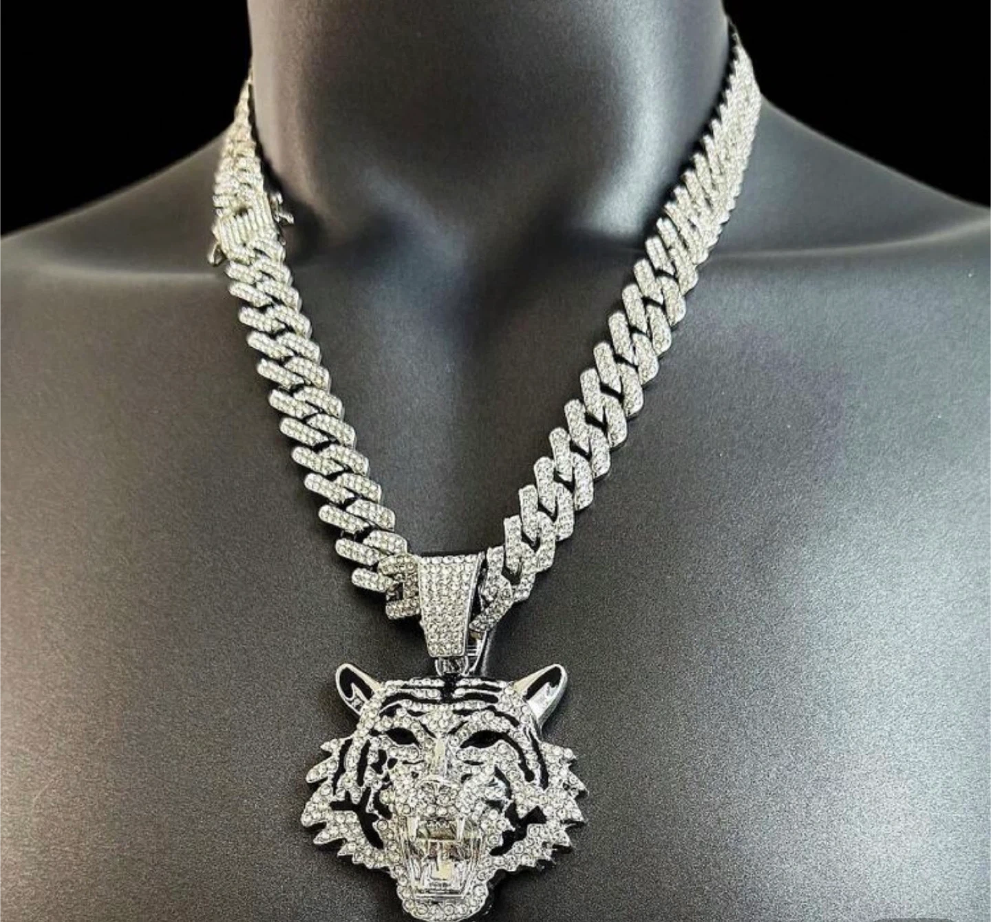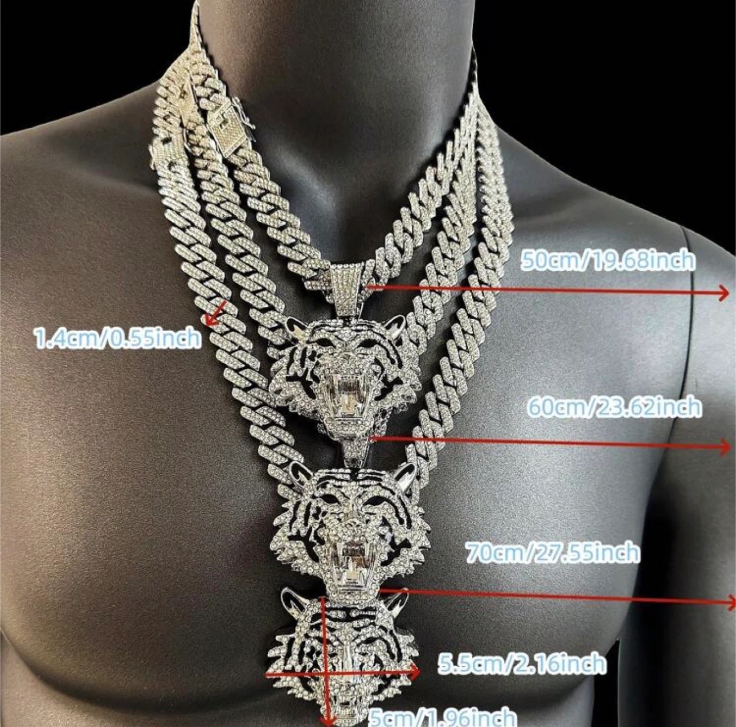 This statement necklace features a fully iced-out tiger head pendant and a Cuban link chain. The pendant measures 5.5cm/1.96inch, and the chain is 50cm/19.68 inches long. It's crafted with sparkling rhinestones for a dazzling look!