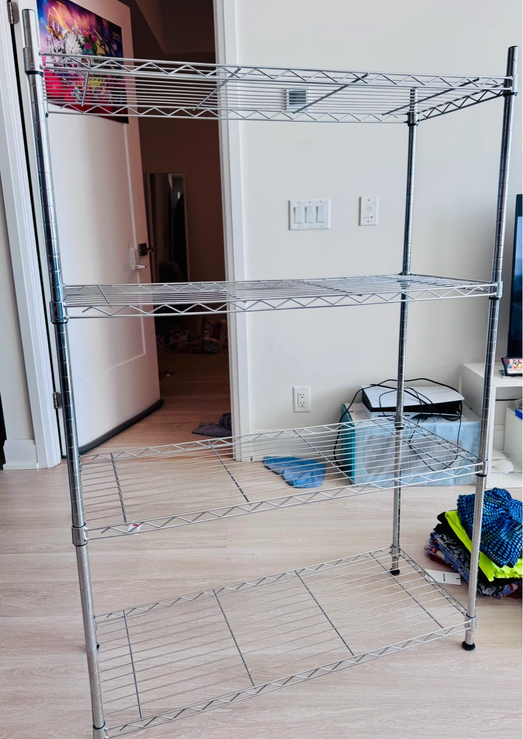 Sturdy metal wire shelving unit in excellent condition. Perfect for organizing storage in the kitchen, garage, laundry room, or basement.