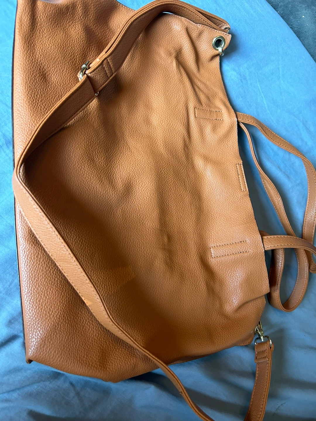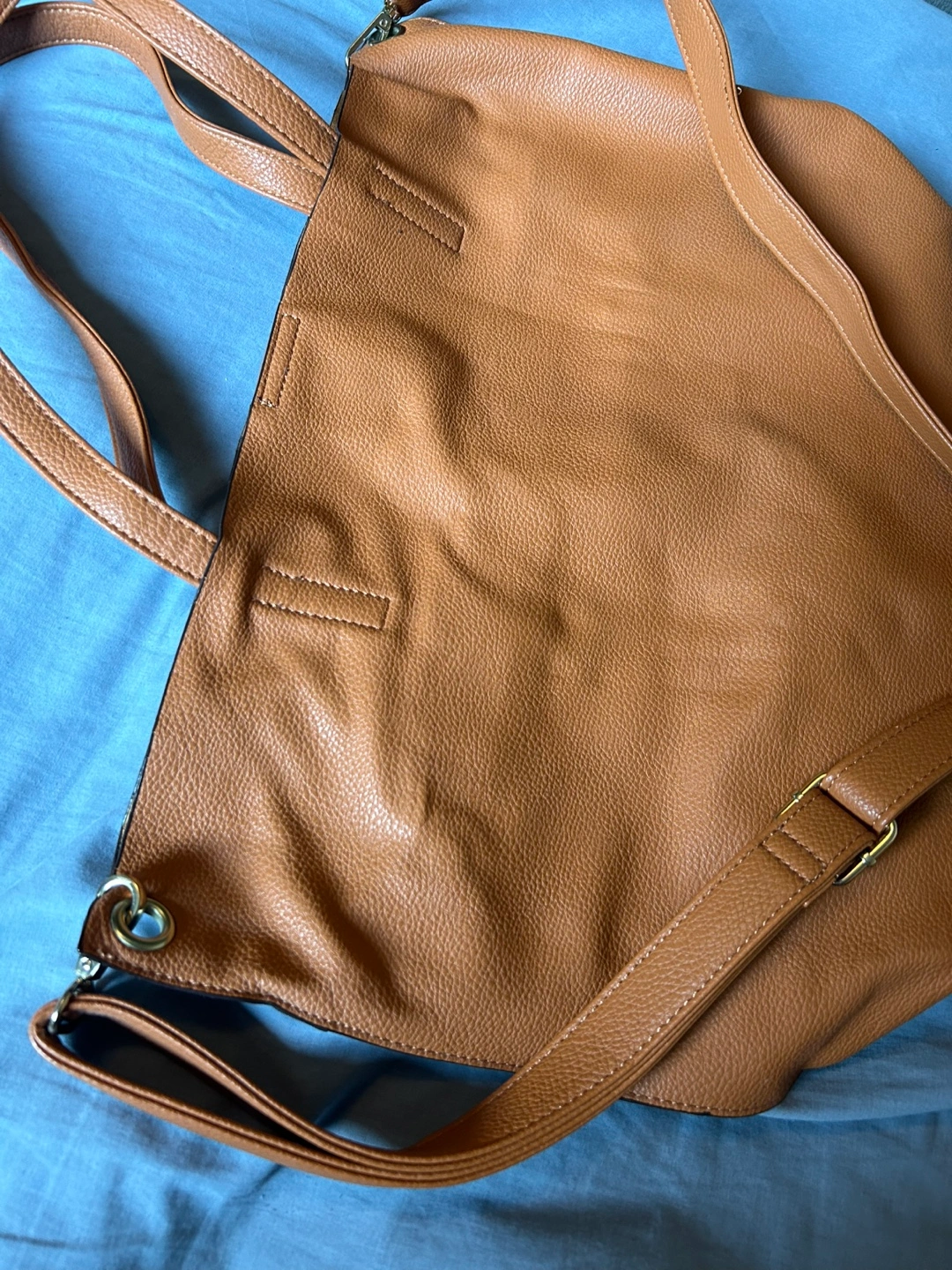 Large tote bag. Light brown faux leather. Features two top handles and a long shoulder strap. Zip closure. Interior lining with small interior pocket.