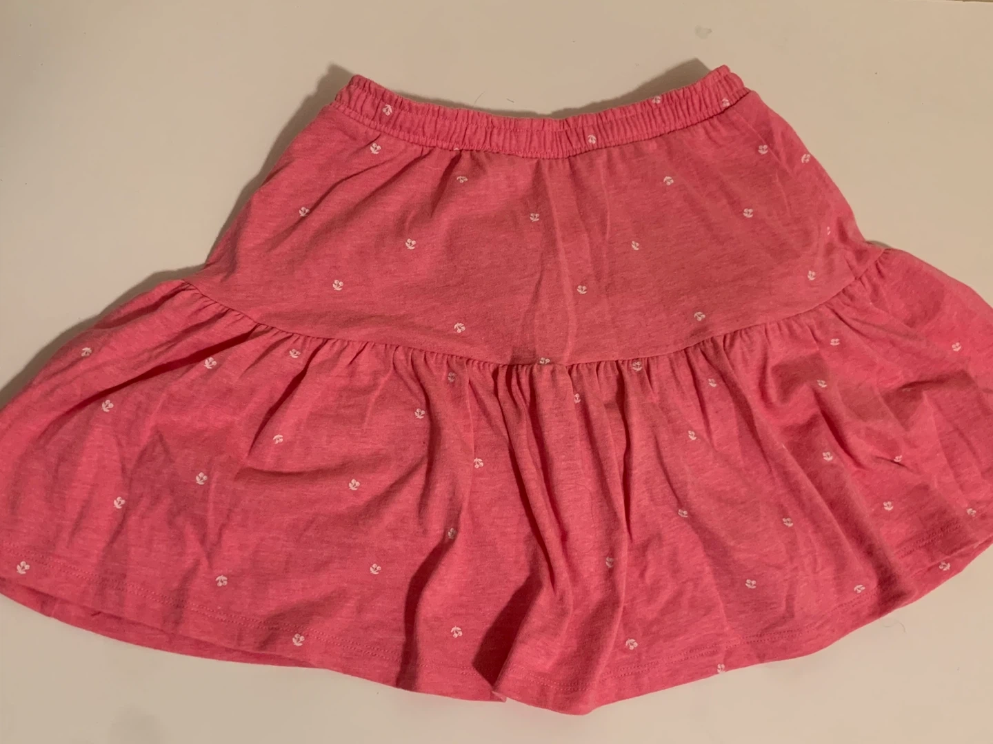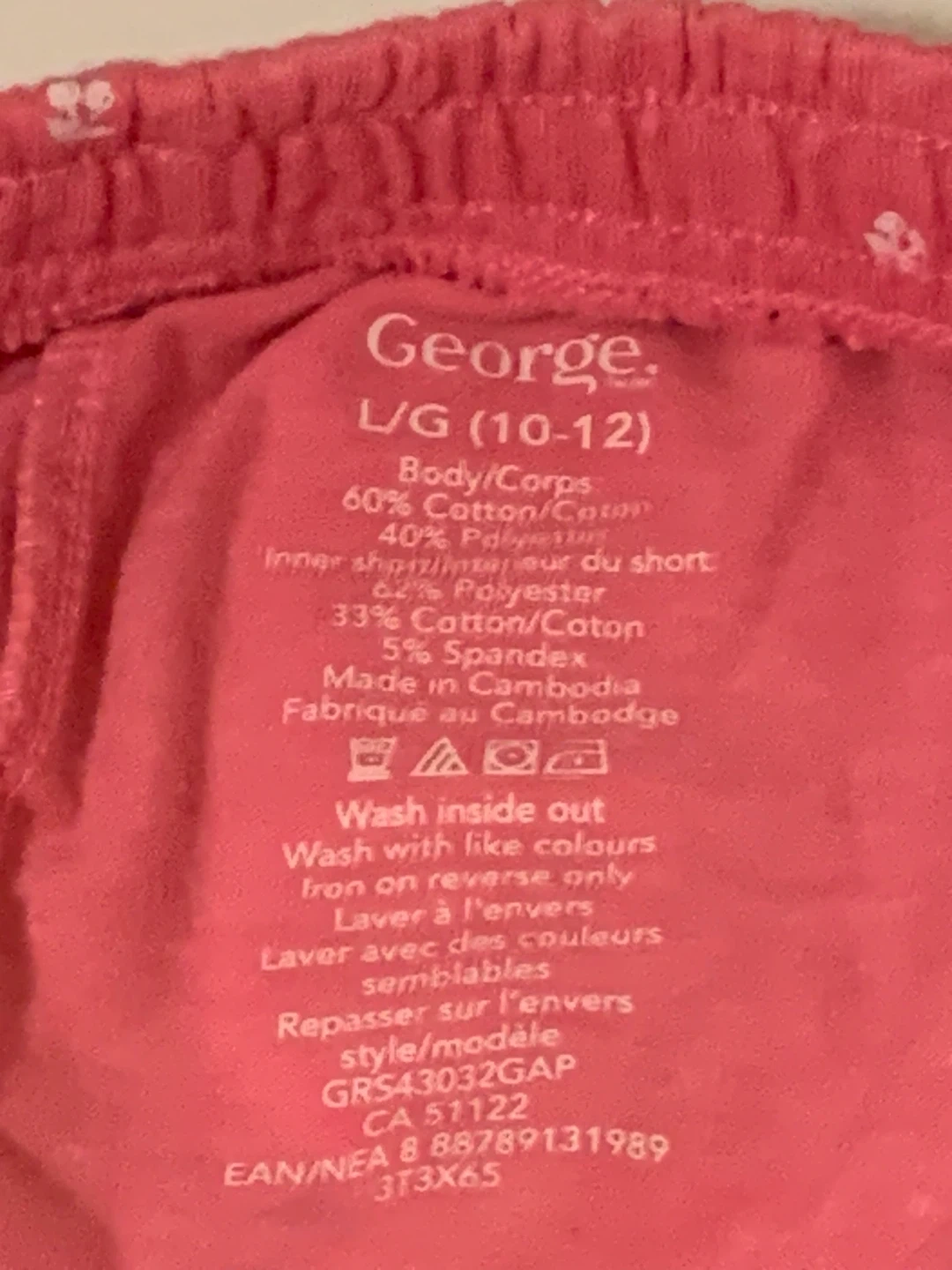 George girl skort in a pink with a white floral pattern. It's a size L/G, which fits a 10-12. The skort has built-in shorts for comfort.