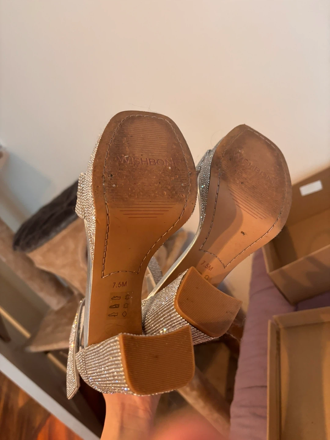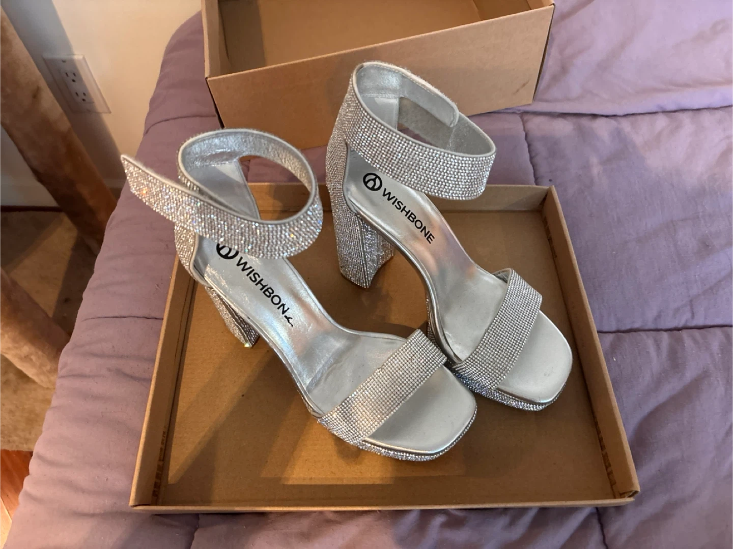 Selling my Gia Crystal Heels in silver rhinestone — super sparkly and perfect for prom, grad, weddings, and formal events. They seriously elevate any dress and look amazing in photos.