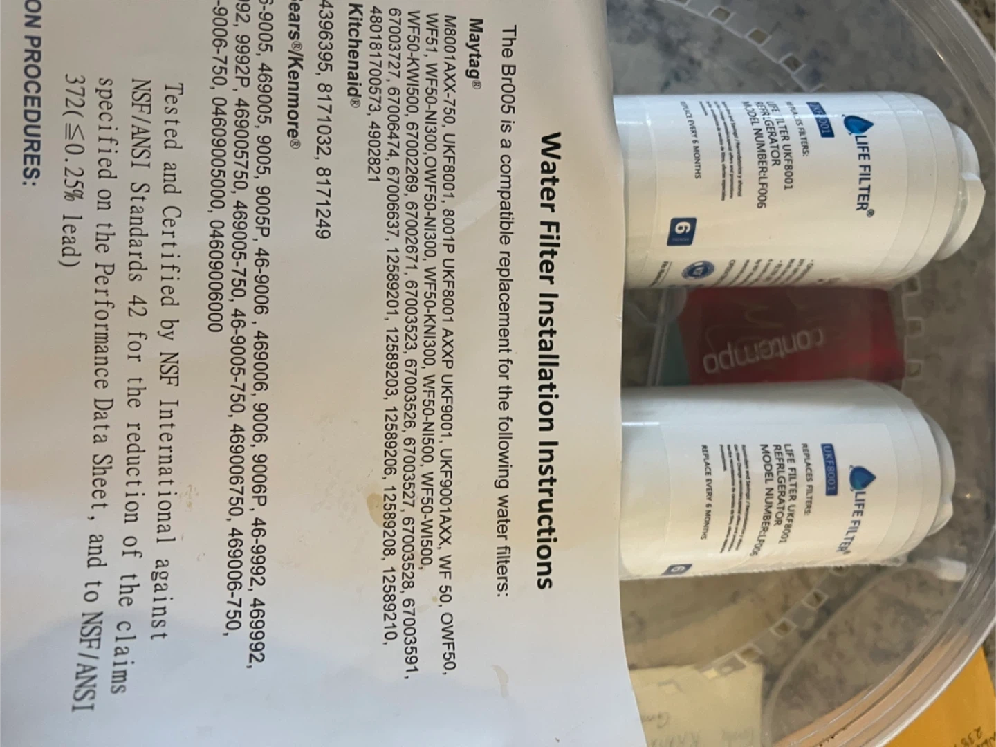 This is a 2-pack of Life Filter UKF8001 refrigerator water filters. They are NSF certified to reduce claims specified on the Performance Data Sheet and NSF/ANSI 372 for lead reduction.