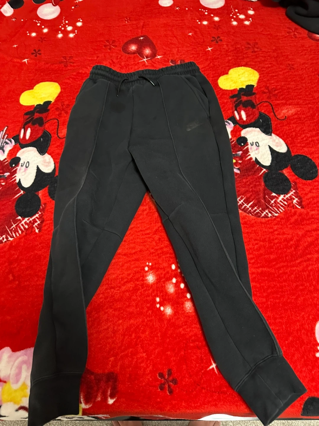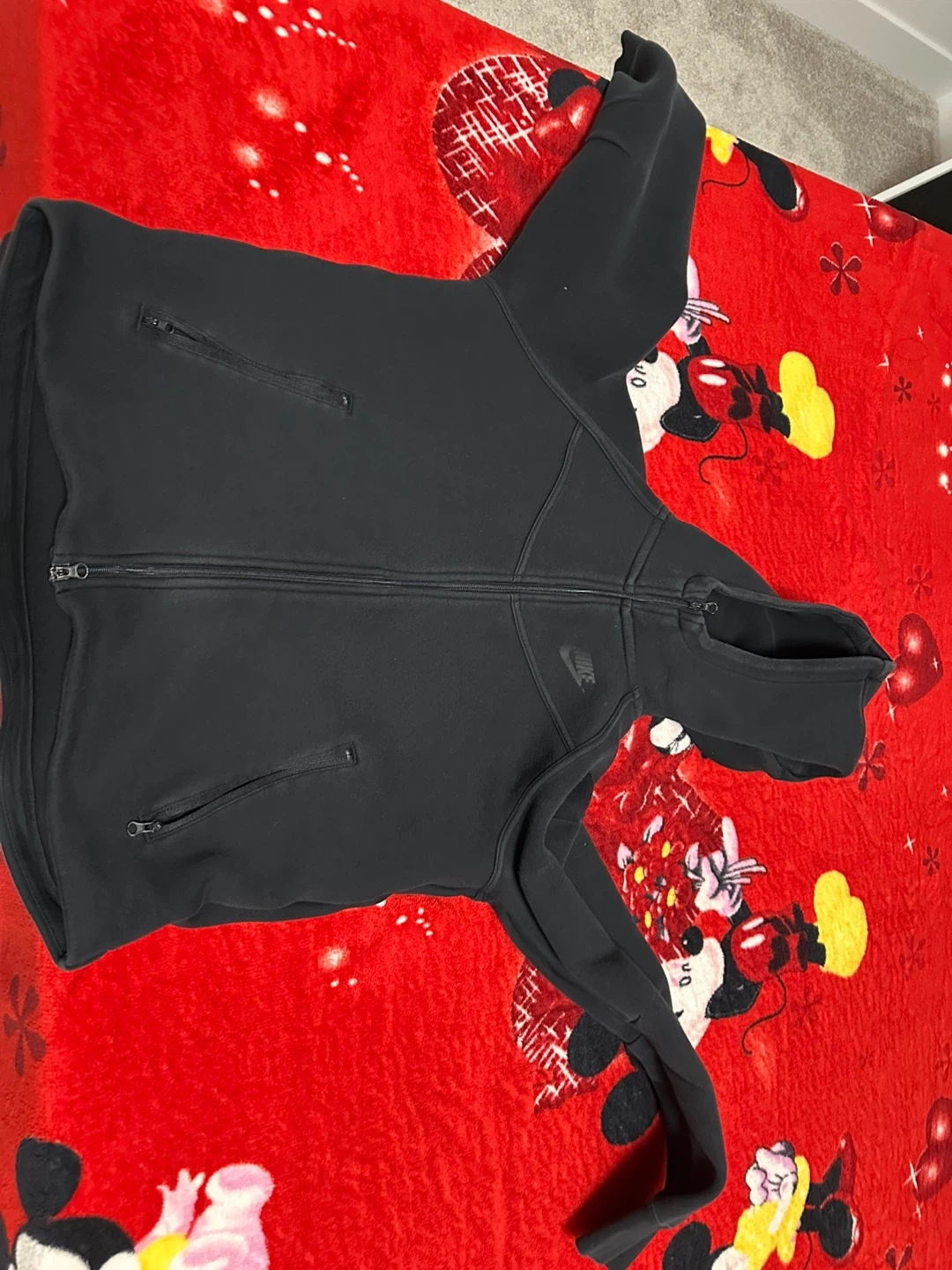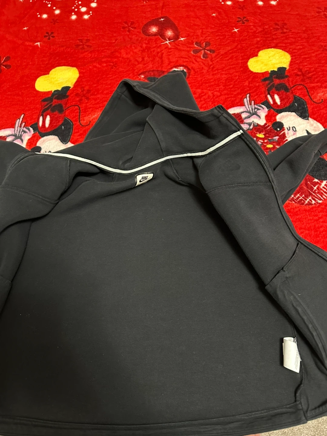 Black Nike Tech Fleece joggers and zip-up hoodie set. Joggers are size L (146-156 CM), and the hoodie is size XL (TG). Made in Vietnam.