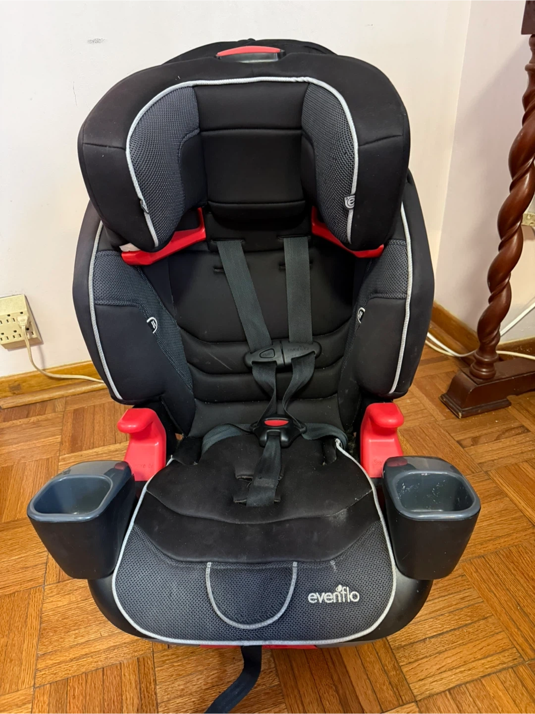 This is an Evenflo booster car seat. It's black with red accents and includes two cup holders. The adjustable headrest ensures a comfortable fit as your child grows. It's suitable for children who have outgrown their forward-facing harness. This seat is perfect for keeping kids safe during car rides.