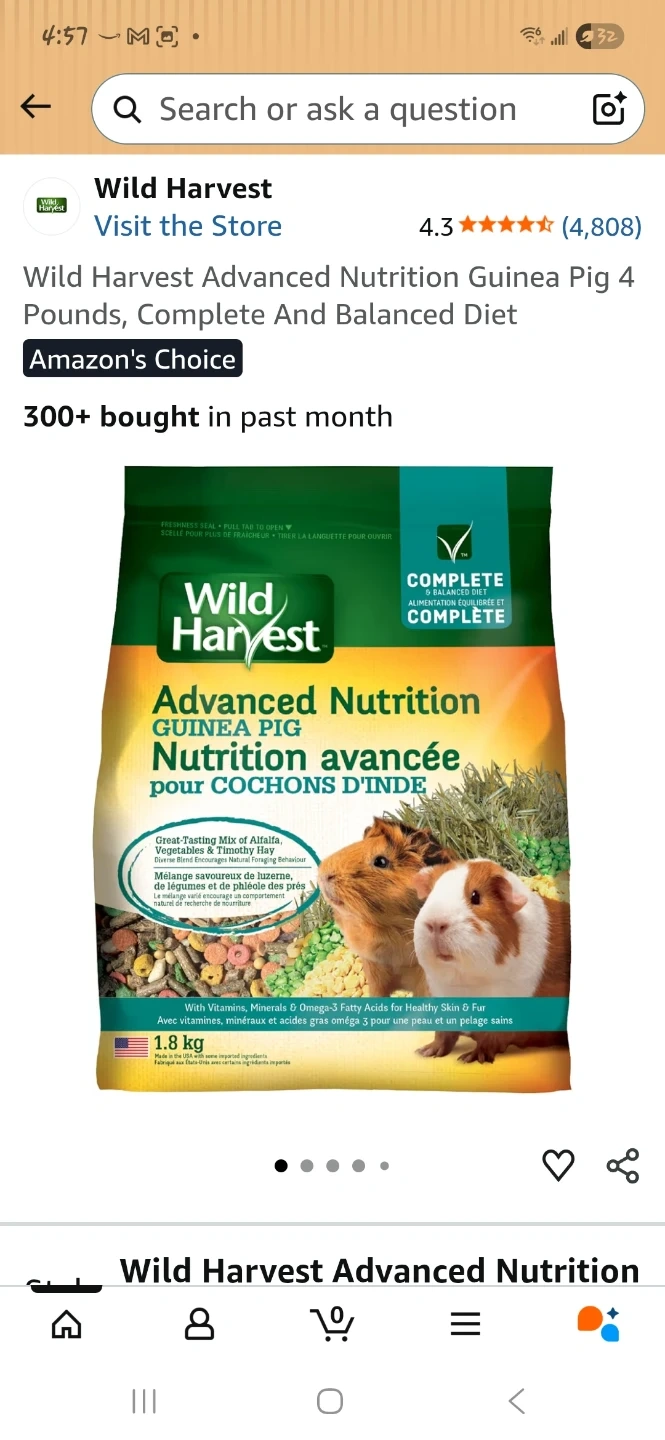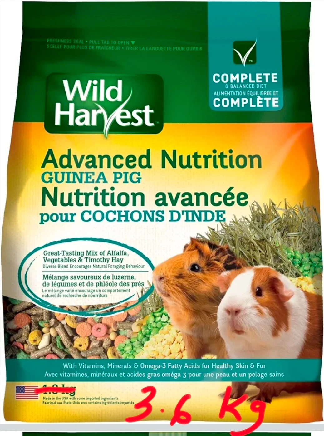 This is Wild Harvest Advanced Nutrition Guinea Pig food. It's a 3.6 kg bag. It contains a great-tasting mix of alfalfa, vegetables, and Timothy Hay. It's formulated with vitamins, minerals, and omega-3 fatty acids for healthy skin and fur.