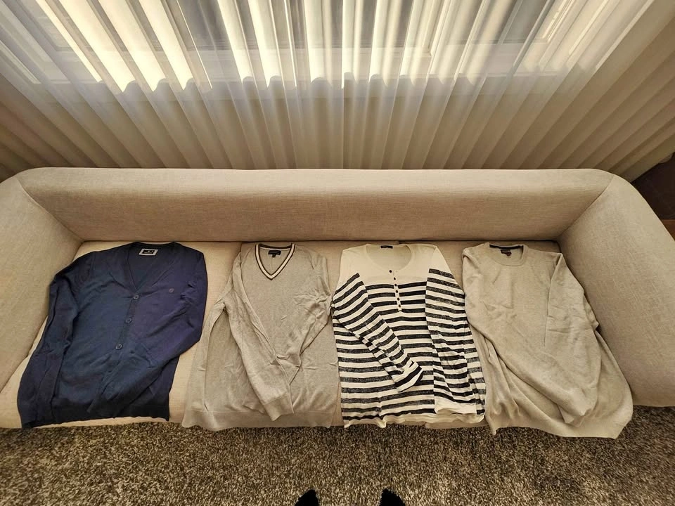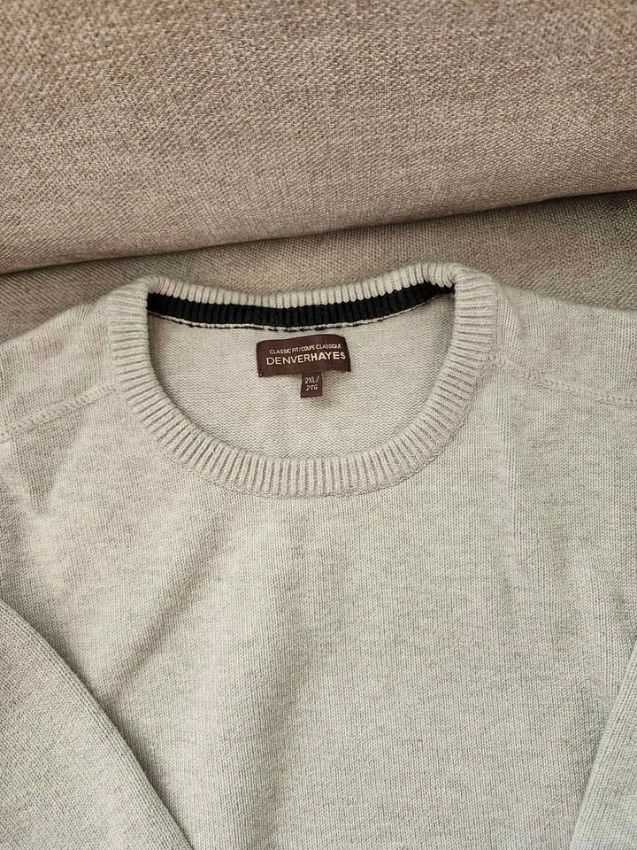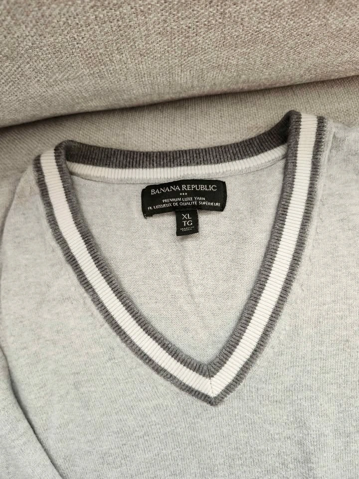 Set of 4 high-quality sweaters in good condition. Perfect for layering or business-casual wear. Navy V-Neck Cardigan: Brand: Forecast (Size XL). Grey V-Neck with Trim: Brand: Banana Republic Luxe Yarn (Size XL). Striped Henley Sweater: Brand: Lefties (Size XL). Grey Crewneck Sweater: Brand: Denver Hayes (Size 2XL). From pet free and smoke free home. Pick up in Chestermere.