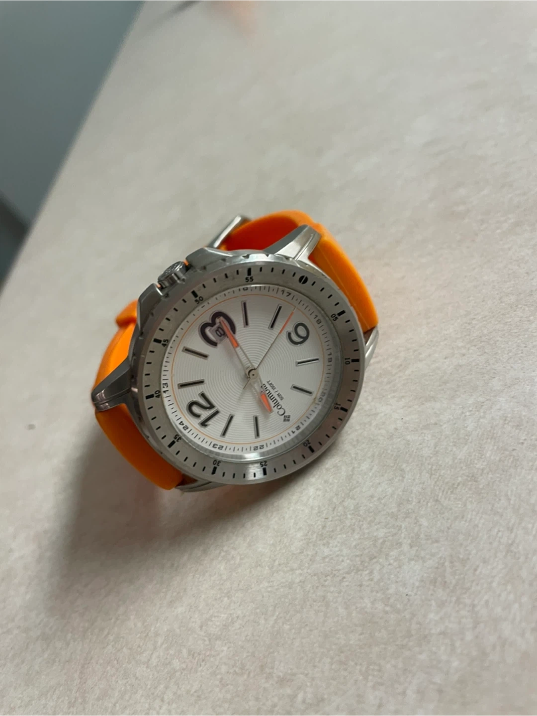 This Columbia watch features a white dial with clear Arabic numerals and a sporty orange silicone strap. It's water-resistant up to 50 meters (150 feet). This timepiece is great for everyday wear or outdoor adventures!