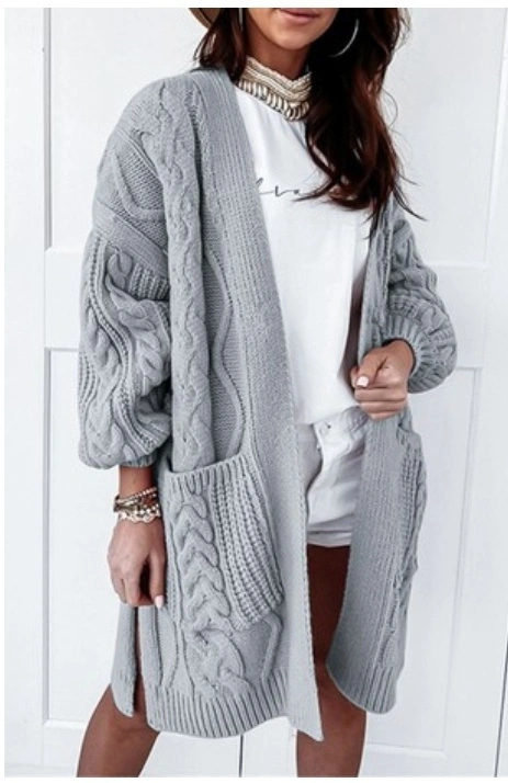 Gray Women's Knitted Woven Pocket Cardigan