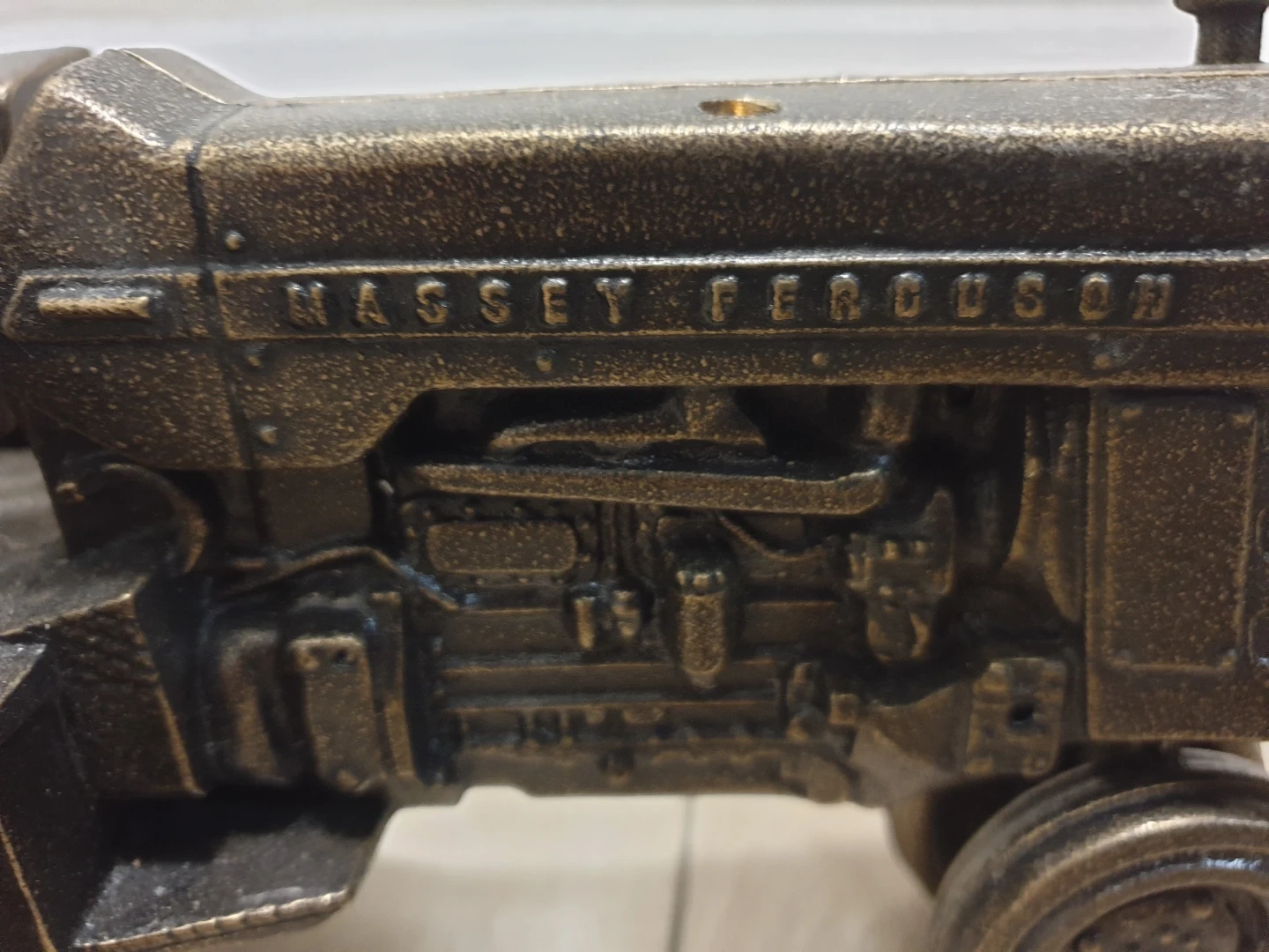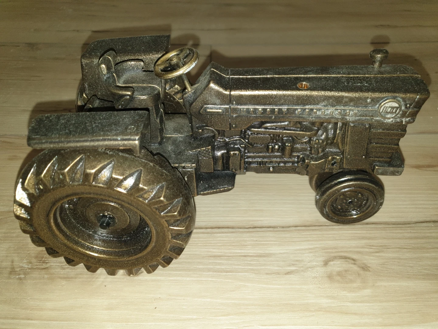 This is a detailed brass figurine of a Massey Ferguson tractor. It features intricate details replicating the engine and tires that actually spin.