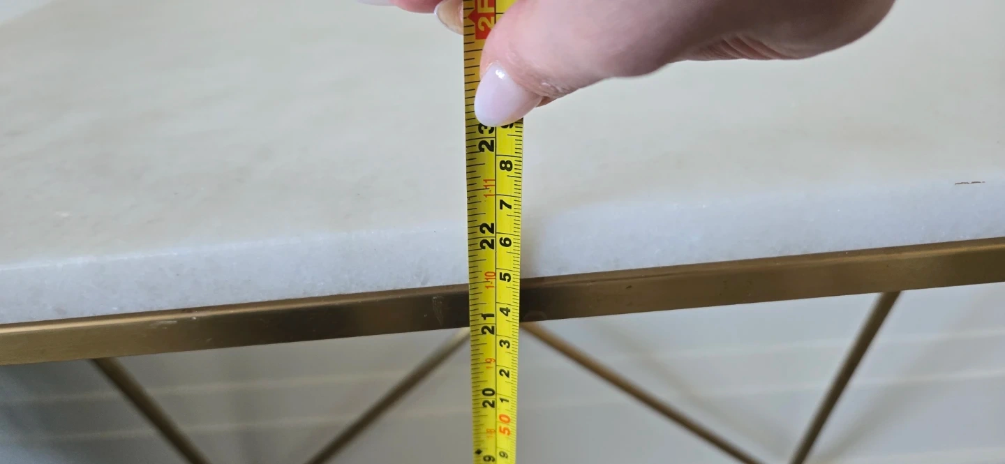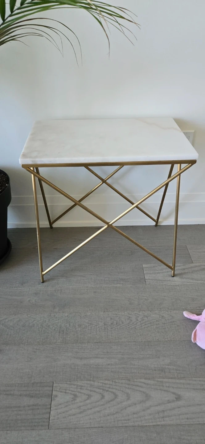 A stylish side table featuring a white marble top and a unique gold geometric metal base. Its compact size makes it suitable for small spaces. Table dimensions: approximately 22 inches in height and 16 inches in width.