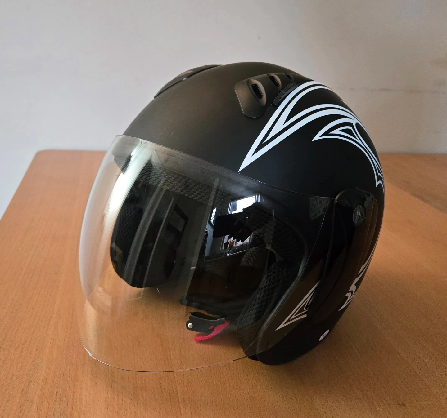 Selling a Tao Motor 818 helmet in black with white accents. It has a clear visor and is in great condition. Perfect for scooter or motorcycle riding! D.O.T Certified Approved