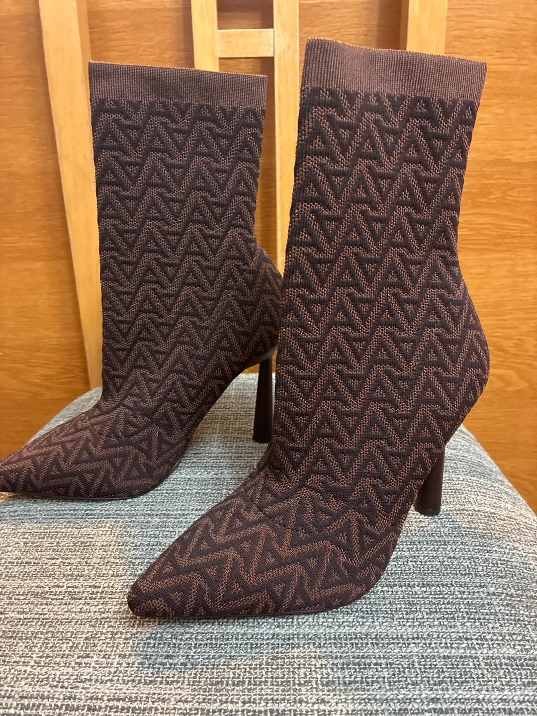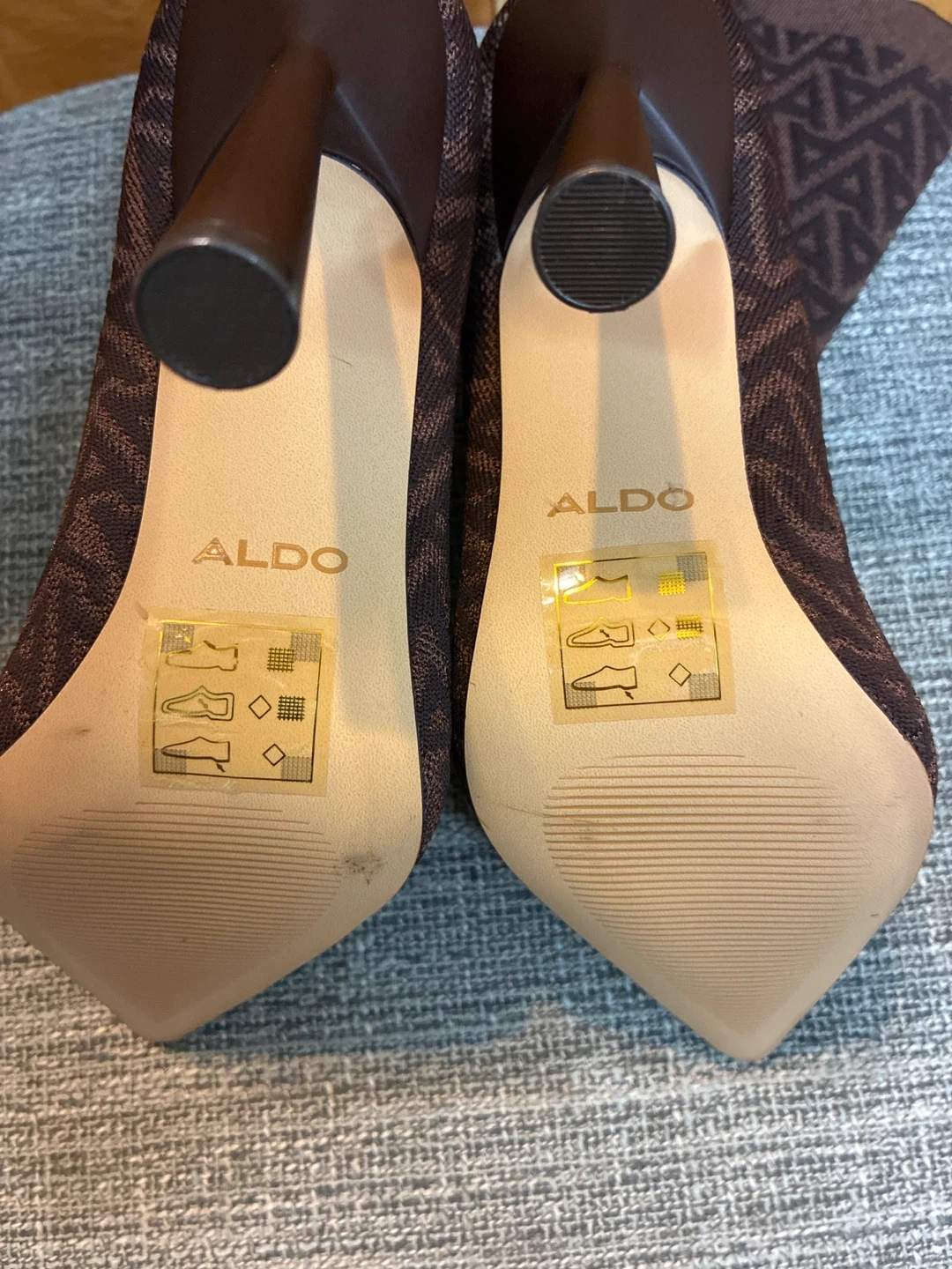 Selling a pair of brand new ALDO heeled boots in a stylish brown knit pattern. Size 7