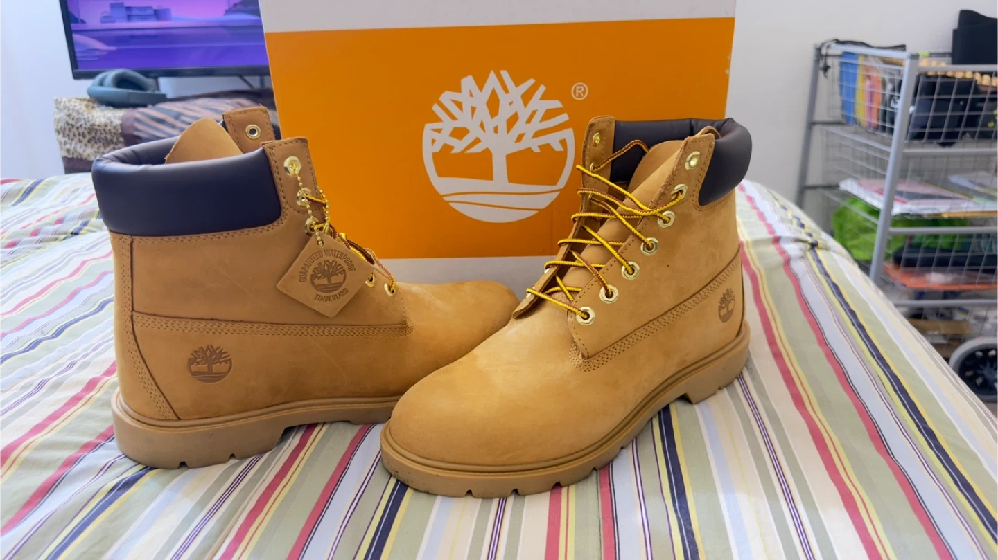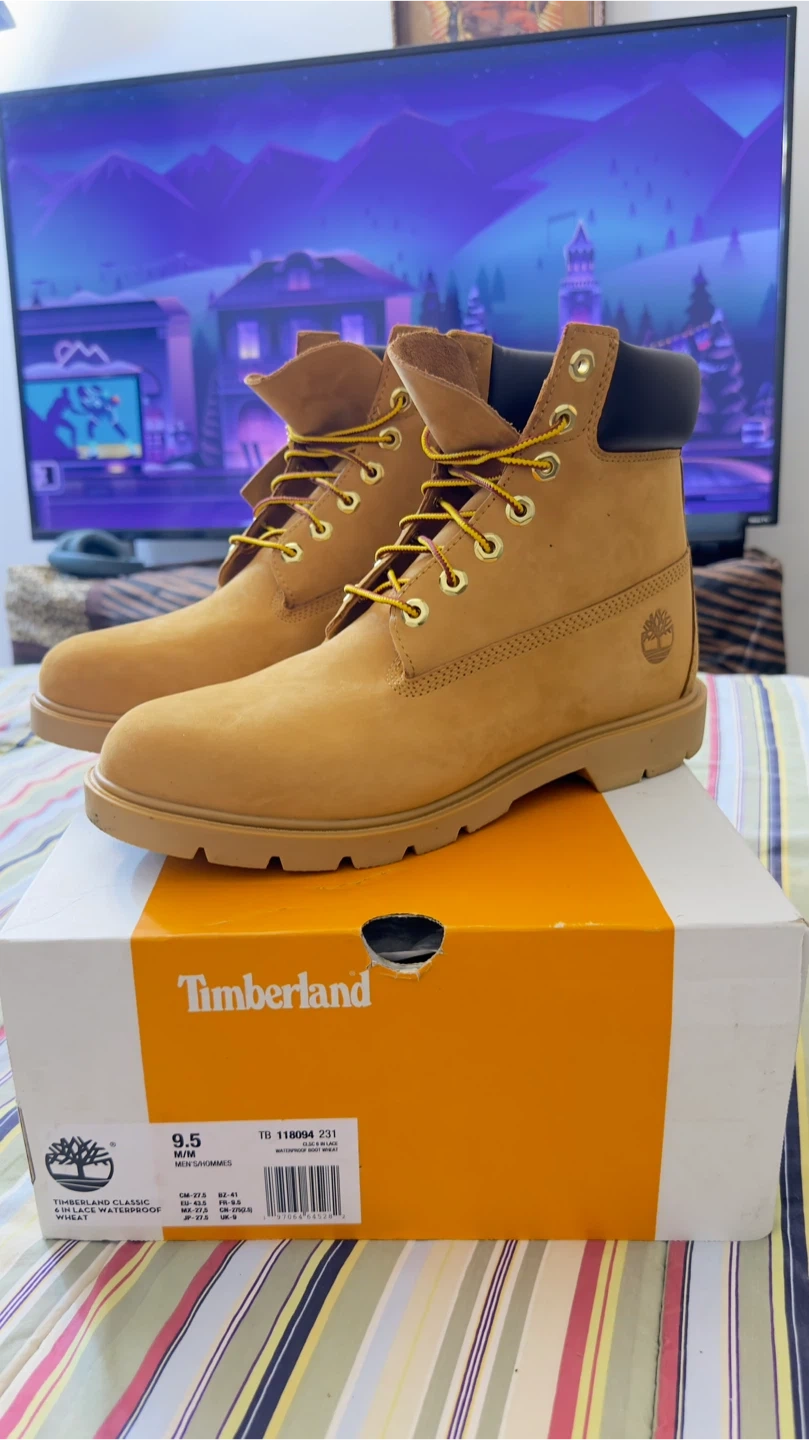 Timberland Classic 6-Inch waterproof boots in tan nubuck. Features a padded collar and lace-up closure with yellow laces. Includes original box. Size 9.5 M/M.